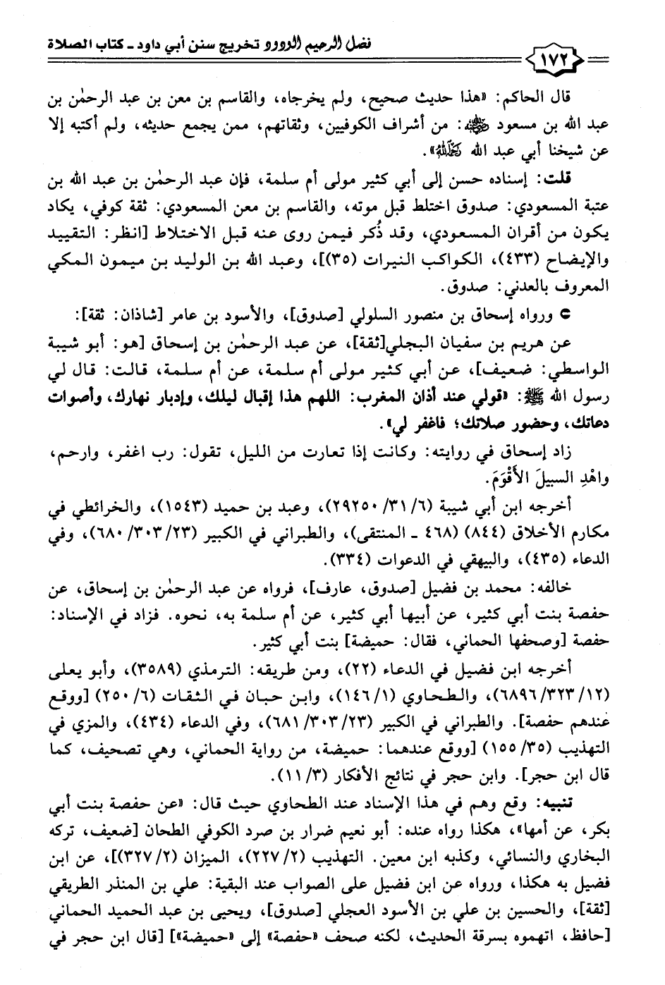 عن هريم بن سفيان البجلي [ثقة]، عن عبد الرحمن بن إسحاق [هو: أبو شيبة الواسطي: ضعيف]، عن أبي كثير مولى أم سلمة، عن أم سلمة، قالت: قال لي رسول الله - صلى الله عليه وسلم -: "قولي عند أذان المغرب: اللهم هذا إقبال ليلك، وإدبار نهارك، وأصوات دعاتك، وحضور صلاتك؛ فاغفر لي".