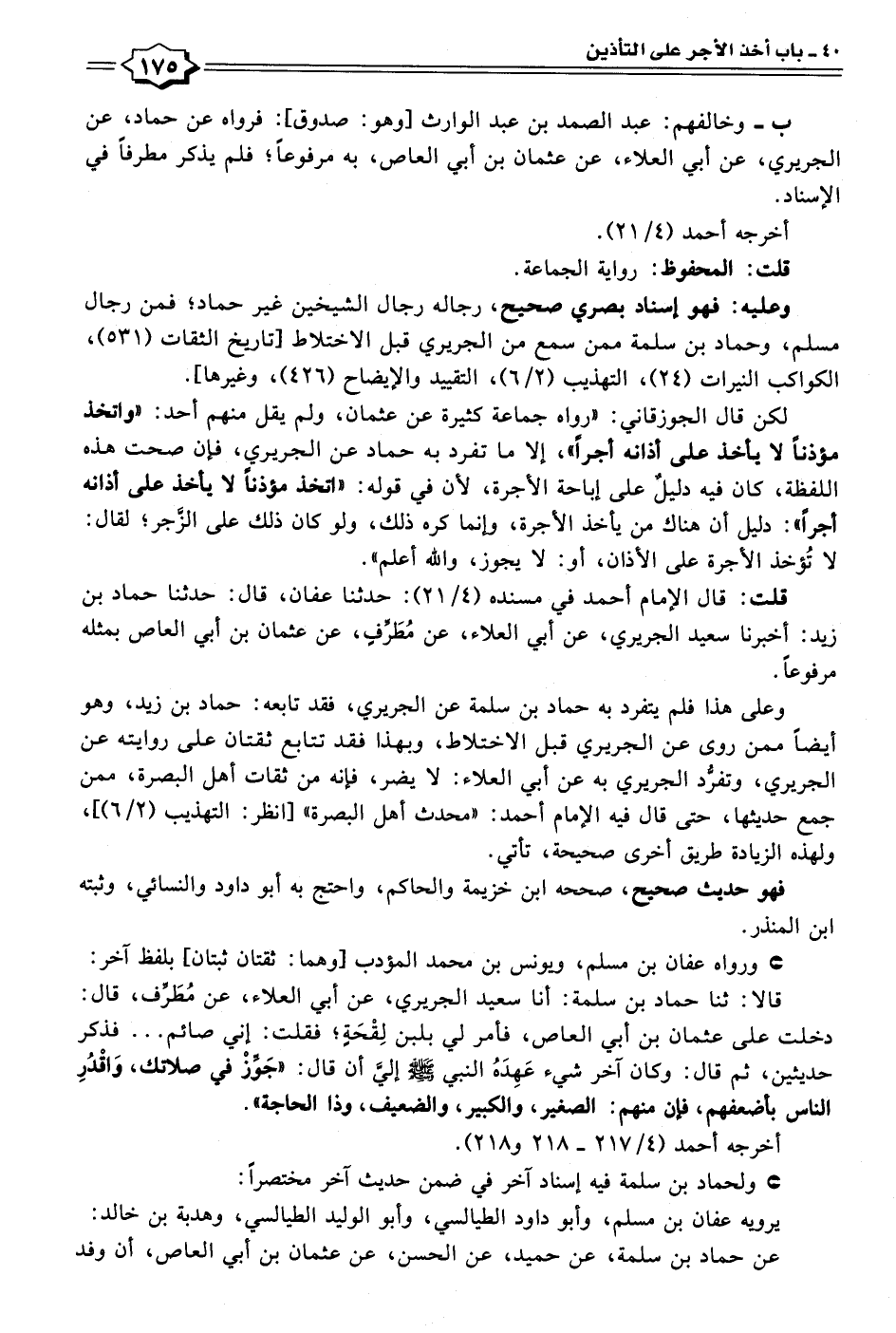 لكن قال الجوزقاني: "رواه جماعة كثيرة عن عثمان، ولم يقل منهم أحد: "واتخذ مؤذنًا لا يأخذ على أذانه أجرًا"، إلا ما تفرد به حماد عن الجريري، فإن صحت هذه اللفظة، كان فيه دليل على إباحة الأجرة، لأنَّ في قوله: "اتخذ مؤذنًا لا يأخذ على أذانه أجرًا": دليل أن هناك من يأخذ الأجرة، وإنما كره ذلك، ولو كان ذلك على الزَّجر؛ لقال: لا تُؤخذ الأجرة على الأذان، أو: لا يجوز، والله أعلم".