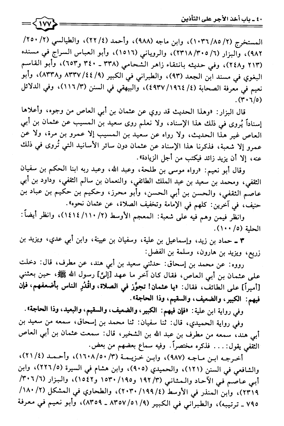 قال البزار: "وهذا الحديث قد روي عن عثمان بن أبي العاص من وجوه، وأعلاها إسنادًا يُروى في ذلك هذا الإسناد، ولا نعلم روى سعيد بن المسيب عن عثمان بن أبي العاص غير هذا الحديث، ولا رواه عن سعيد بن المسيب إلا عمرو بن مرة، ولا عن عمرو إلا شعبة، فذكرنا هذا الإسناد عن عثمان دون سائر الأسانيد التي تُروى في ذلك عنه، إلا أن يزيد زائد فيكتب من أجل الزيادة".