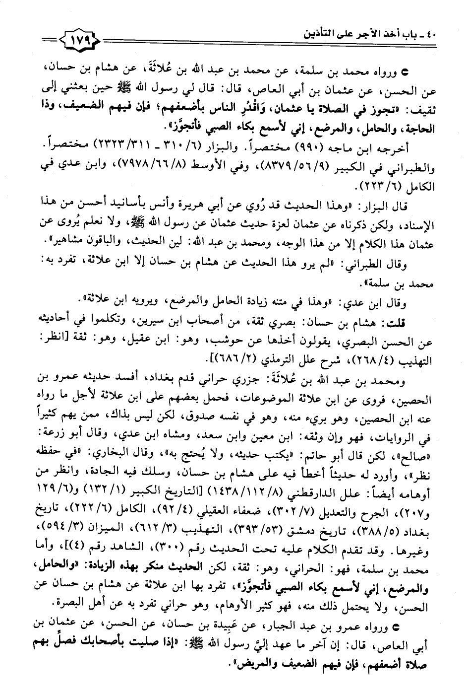 ومحمد بن عبد الله بن عُلاثَةَ: جزري حراني قدم بغداد، أفسد حديثه عمرو بن الحصين، فروى عن ابن علاثة الموضوعات، فحمل بعضهم على ابن علاثة لأجل ما رواه عنه ابن الحصين، وهو بريء منه، وهو في نفسه صدوق، لكن ليس بذاك، ممن يهم كثيرًا في الروايات، فهو وإن وثقه: ابن معين وابن سعد، ومشاه ابن عدي، وقال أبو زرعة: "صالح"، لكن قال أبو حاتم: "يكتب حديثه، ولا يُحتج به"، وقال البخاري: "في حفظه نظر"، وأورد له حديثًا أخطأ فيه على هشام بن حسان، وسلك فيه الجادة، وانظر من أوهامه أيضًا: علل الدارقطني (٨/ ١١٢/ ١٤٣٨) [التاريخ الكبير (١/ ١٣٢) و (٦/ ١٢٩ و ٢٠٧)، الجرح والتعديل (٧/ ٣٠٢)، ضعفاء العقيلي (٤/ ٩٢)، الكامل (٦/ ٢٢٢)، تاريخ بغداد (٥/ ٣٨٨)، تاريخ دمشق (٥٣/ ٣٩٣)، التهذيب (٣/ ٦١٢)، الميزان (٣/ ٥٩٤)، وغيرها. وقد تقدم الكلام عليه تحت الحديث رقم (٣٠٠)، الشاهد رقم (٤)]، وأما محمد بن سلمة، فهو: الحراني، وهو: ثقة، لكن الحديث منكر بهذه الزيادة: "والحامل، والمرضع، إني لأسمع بكاء الصبي فأتجوَّز"، تفرد بها ابن علاثة عن هشام بن حسان عن الحسن، ولا يحتمل ذلك منه، فهو كثير الأوهام، وهو حراني تفرد به عن أهل البصرة.