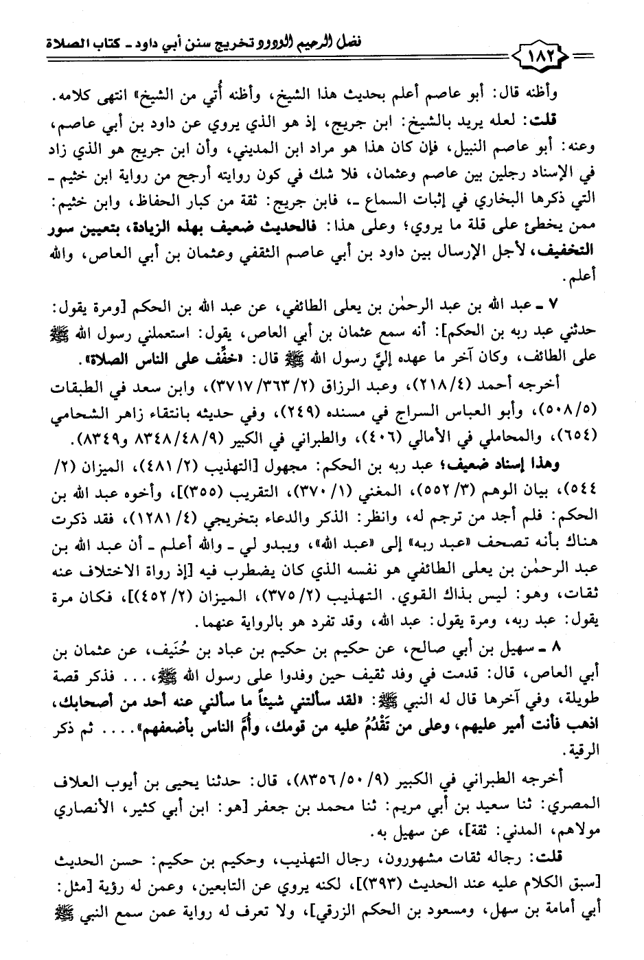 قلت: لعله يريد بالشيح: ابن جريج، إذ هو الَّذي يروي عن داود بن أبي عاصم، وعنه: أبو عاصم النبيل، فإن كان هذا هو مراد ابن المديني، وأن ابن جريج هو الَّذي زاد في الإسناد رجلين بين عاصم وعثمان، فلا شك في كون روايته أرجح من رواية ابن خثيم -التي ذكرها البخاري في إثبات السماع-، فابن جريج: ثقة من كبار الحفاظ، وابن خثيم: ممن يخطئ على قلة ما يروي؛ وعلى هذا: فالحديث ضعيف بهذه الزيادة، بتعيين سور التخفيف، لأجل الإرسال بين داود بن أبي عاصم الثقفي وعثمان بن أبي العاص، والله أعلم.