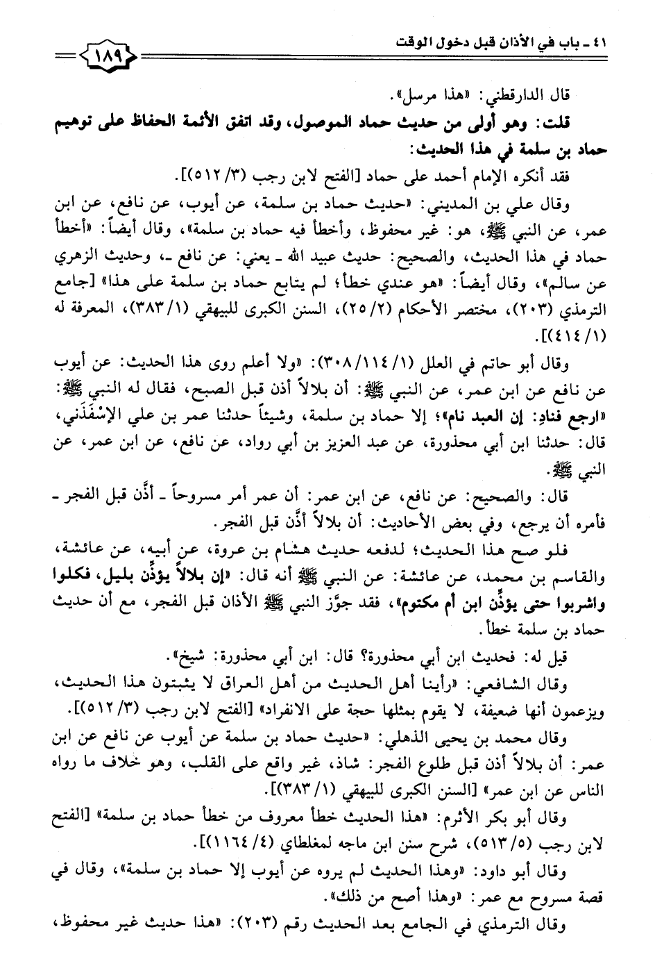 وقال محمد بن يحيى الذهلي: "حديث حماد بن سلمة عن أيوب عن نافع عن ابن عمر: أن بلالًا أذن قبل طلوع الفجر: شاذ، غير واقع على القلب، وهو خلاف ما رواه الناس عن ابن عمر" [السنن الكبرى للبيهقي (١/ ٣٨٣)].