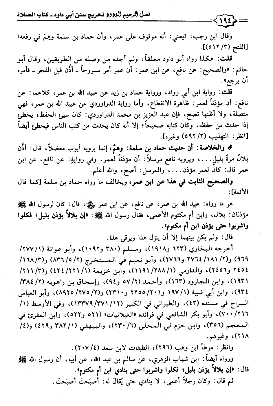 • والخلاصة: أن حديث حماد بن سلمة: وهمٌ، إنما يرويه أيوب معضلًا، قال: أذن بلالٌ مرةً بليلٍ ... ، ويرويه نافع مرسلًا: أن مؤذنًا لعمر، وفي روايةٍ: عن نافع، عن ابن عمر قال: كان لعمر مؤذن ... ، والمرسل: أصح، والله أعلم.
