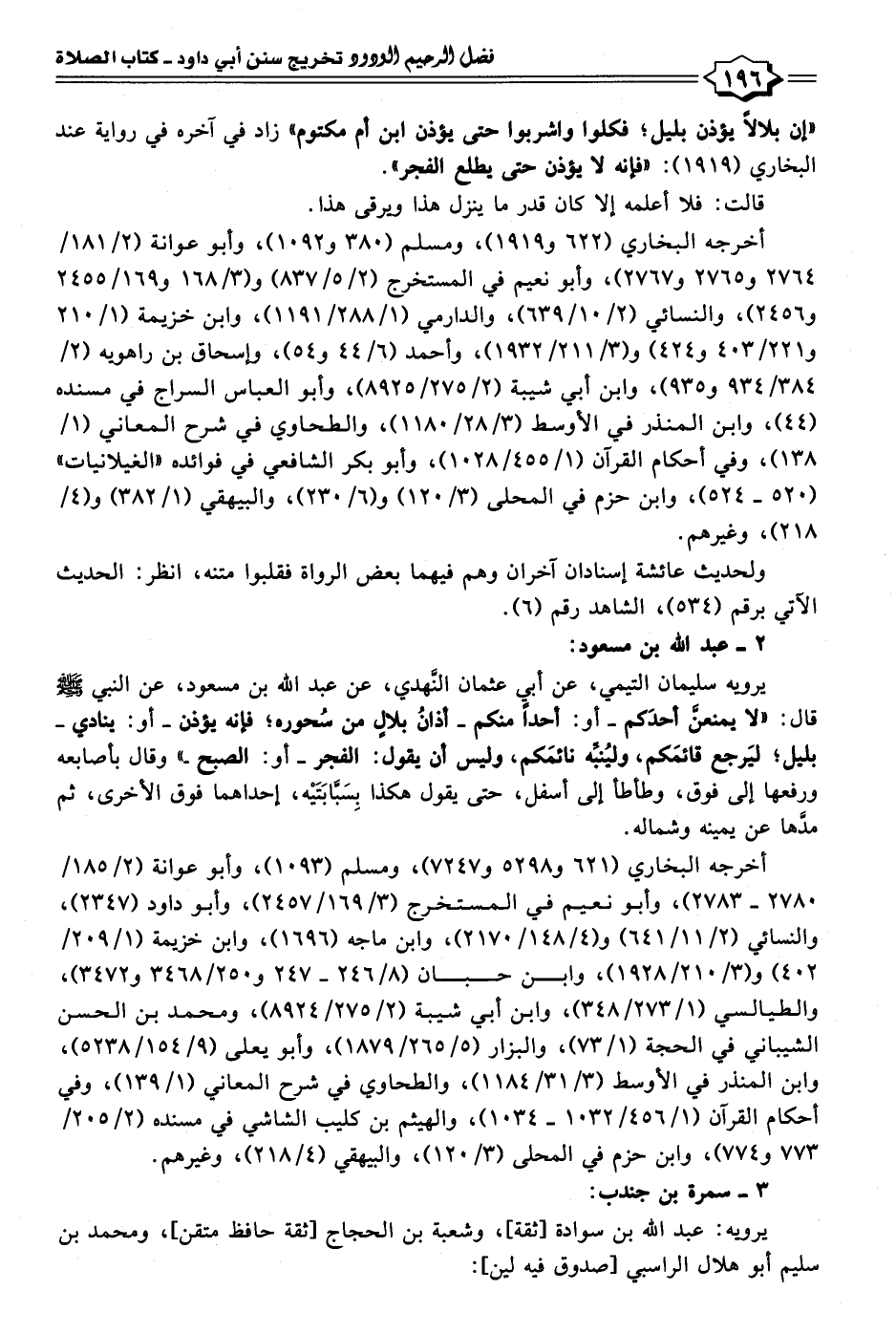 يرويه سليمان التيمي، عن أبي عثمان النهدي، عن عبد الله بن مسعود، عن النبي - صلى الله عليه وسلم - قال: "لا يمنعنَّ أحدَكم - أو: أحدًا منكم - أذانُ بلالٍ من سُحوره؛ فإنه يؤذن - أو: ينادي - بليل؛ ليَرجع قائمَكم، وليُنبِّه نائمَكم، وليس أن يقول: الفجر - أو: الصبح -" وقال بأصابعه ورفعها إلى فوق، وطأطأ إلى أسفل، حتَّى يقول هكذا بسَبَّابَتَيْه، إحداهما فوق الأخرى، ثم مدَّها عن يمينه وشماله.