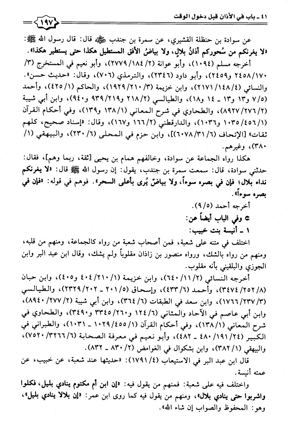 هكذا رواه الجماعة عن سوادة، وخالفهم همام بن يحيى [ثقة، ربما وهم]، فقال: حدثني سوادة، قال: سمعت سمرة بن جندب، يقول: إن رسول الله - صلى الله عليه وسلم - قال: "لا يغرنكم نداء بلال؛ فإن في بصره سوءًا، ولا بياضٌ يُرى بأعلى السحر". فوهم في قوله: "فإن في بصره سوءًا".