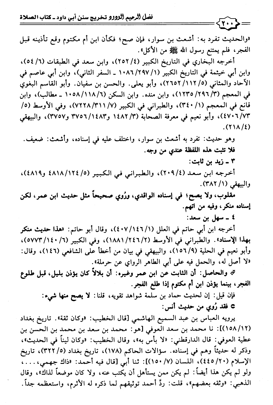 "والحديث تفرد به: أشعث بن سوار، فإن صح؛ فكان ابن أم مكتوم وقع تأذينه قبل الفجر، فلم يمتنع رسول الله - صلى الله عليه وسلم - من الأكل".