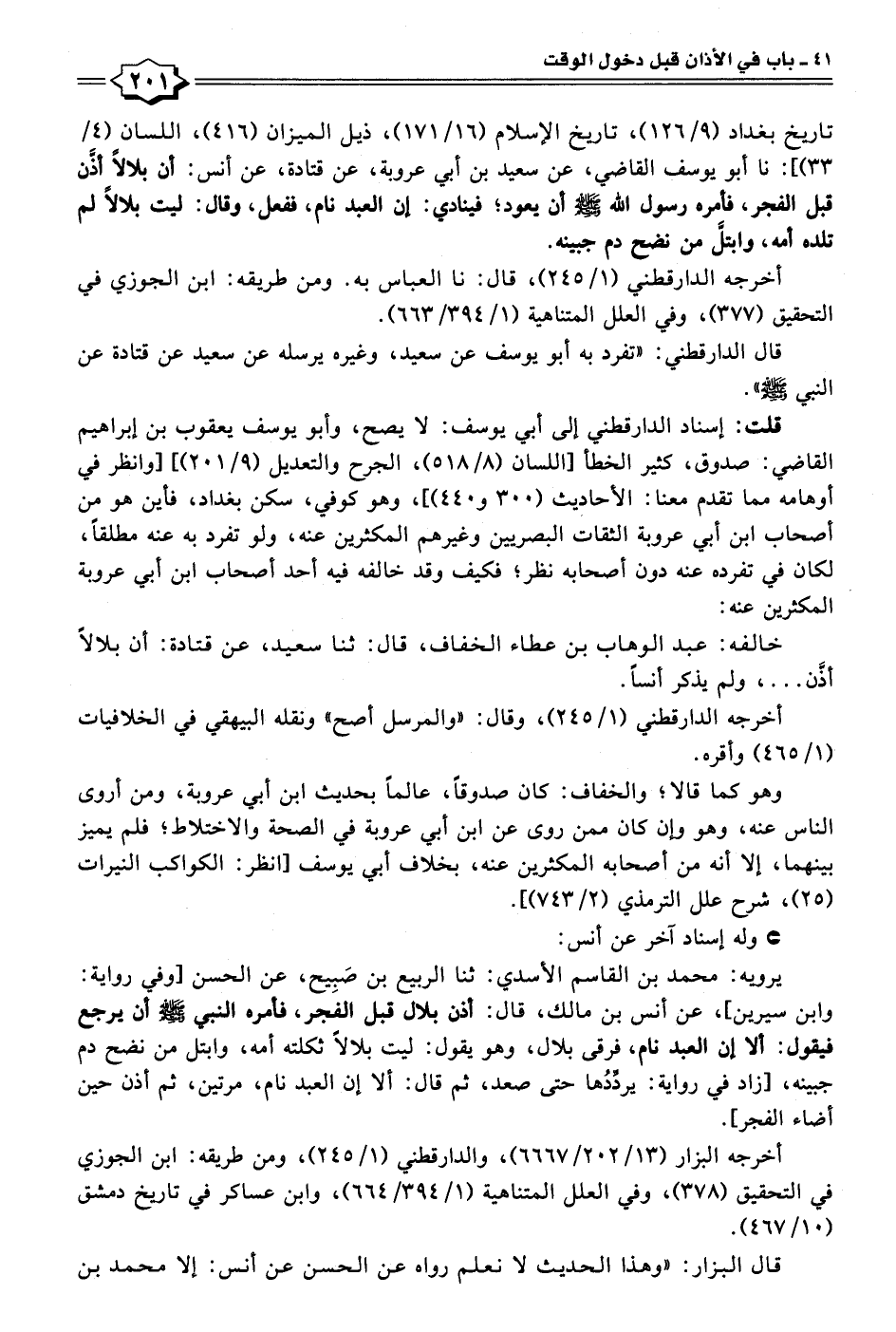 تاريخ بغداد (٩/ ١٢٦)، تاريخ الإسلام (١٦/ ١٧١)، ذيل الميزان (٤١٦)، اللسان (٤/ ٣٣): نا أبو يوسف القاضي، عن سعيد بن أبي عروبة، عن قتادة، عن أَنس: أن بلالًا أذن قبل الفجر، فأمره رسول الله - صلى الله عليه وسلم - أن يعود؛ فينادي: إن العبد نام، ففعل، وقال: ليت بلالًا لم تلده أمه، وابتلَّ من نضح دم جبينه.