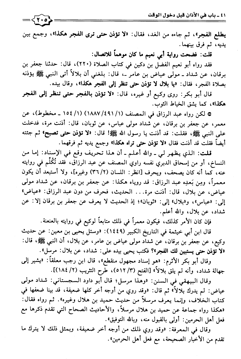 وقال البيهقي في السنن: "وهذا مرسل؛ قال أبو داود السجستاني: شداد مولى عياض: لم يدرك بلالًا" ثم قال: "وقد روي من أوجه آخر كلها ضعيفة، قد بينا ضعفها في كتاب الخلاف، وإنما يعرف مرسلًا من حديث حميد بن هلال وغيره". ثم رواه فقال: "هكذا رواه جماعة عن حميد بن هلال مرسلًا، والأحاديث الصحاح التي تقدم ذكرها مع فعل أهل الحرمين: أولى بالقبول منه، وبالله التوفيق".