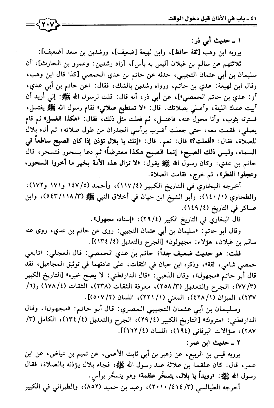 يرويه ابن وهب [ثقة حافظ]، وابن لهيعة [ضعيف]، ورشدين بن سعد [ضعيف]: ثلاثتهم عن سالم بن غيلان [ليس به بأس]، [زاد رشدين: وعمرو بن الحارث]، أن سليمان بن أبي عثمان التجيبي، حدثه عن حاتم بن عدي الحمصي [كذا قال ابن وهب، وقال ابن لهيعة: عدي بن حاتم، ورواه رشدين بالشك، فقال: "عن حاتم بن أبي عدي، أو: عدي بن حاتم الحمصي"]، عن أبي ذر، أنَّه قال: قلت لرسول الله - صلى الله عليه وسلم -: إني أريد أن أبيت عندك الليلة، وأصلي بصلاتك. قال: "لا تستطيع صلاتي" فقام رسول الله - صلى الله عليه وسلم - يغتسل، فسترته بثوب، وأنا محول عنه، فاغتسل، ثم فعلت مثل ذلك، فقال: "هكذا الغسل" ثم قام يصلي، فقمت معه، حتَّى جعلت أضرب برأسي الجدران من طول صلاته، ثم أتاه بلال للصلاة، فقال: "أفعلت؟ " قال: نعم. قال: "إنك يا بلال تؤذن إذا كان الصبح ساطعًا في السماء، وليس ذلك الصبح؛ إنما الصبح هكذا معترضًا" ثم دعا بسحور فتسحر، قال حاتم بن عدي: وكان رسول الله - صلى الله عليه وسلم - يقول: "لا تزال هذه الأمة بخير ما أخروا السحور، وعجلوا الفطر"، ثم خرج، فقامت الصلاة.
