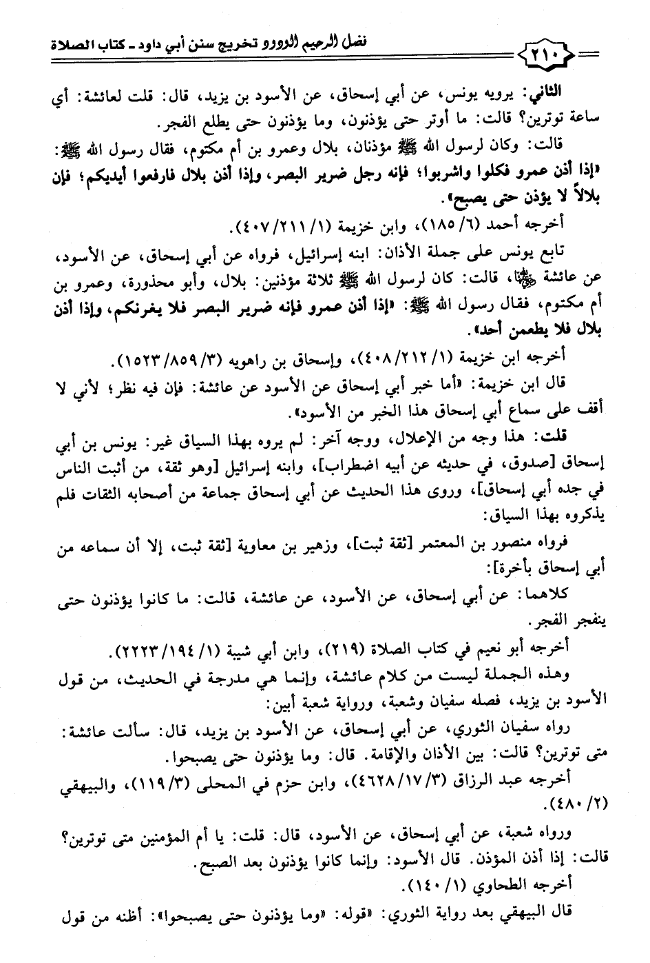 تابع يونس على جملة الأذان: ابنه إسرائيل، فرواه عن أبي إسحاق، عن الأسود، عن عائشة - رضي الله عنها -، قالت: كان لرسول الله - صلى الله عليه وسلم - ثلاثة مؤذنين: بلال، وأبو محذورة، وعمرو بن أم مكتوم، فقال رسول الله - صلى الله عليه وسلم -: "إذا أذن عمرو فإنه ضرير البصر فلا يغرنكم، وإذا أذن بلال فلا يطعمن أحد".
