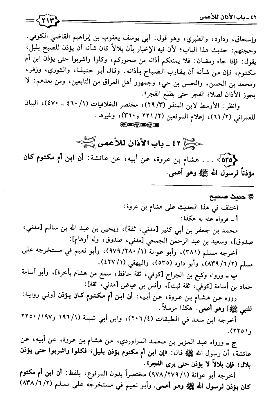 ٥٣٥ - . . . هشام بن عروة، عن أبيه، عن عائشة: أن ابن أم مكتوم كان مؤذنًا لرسول الله - صلى الله عليه وسلم - وهو أعمى.