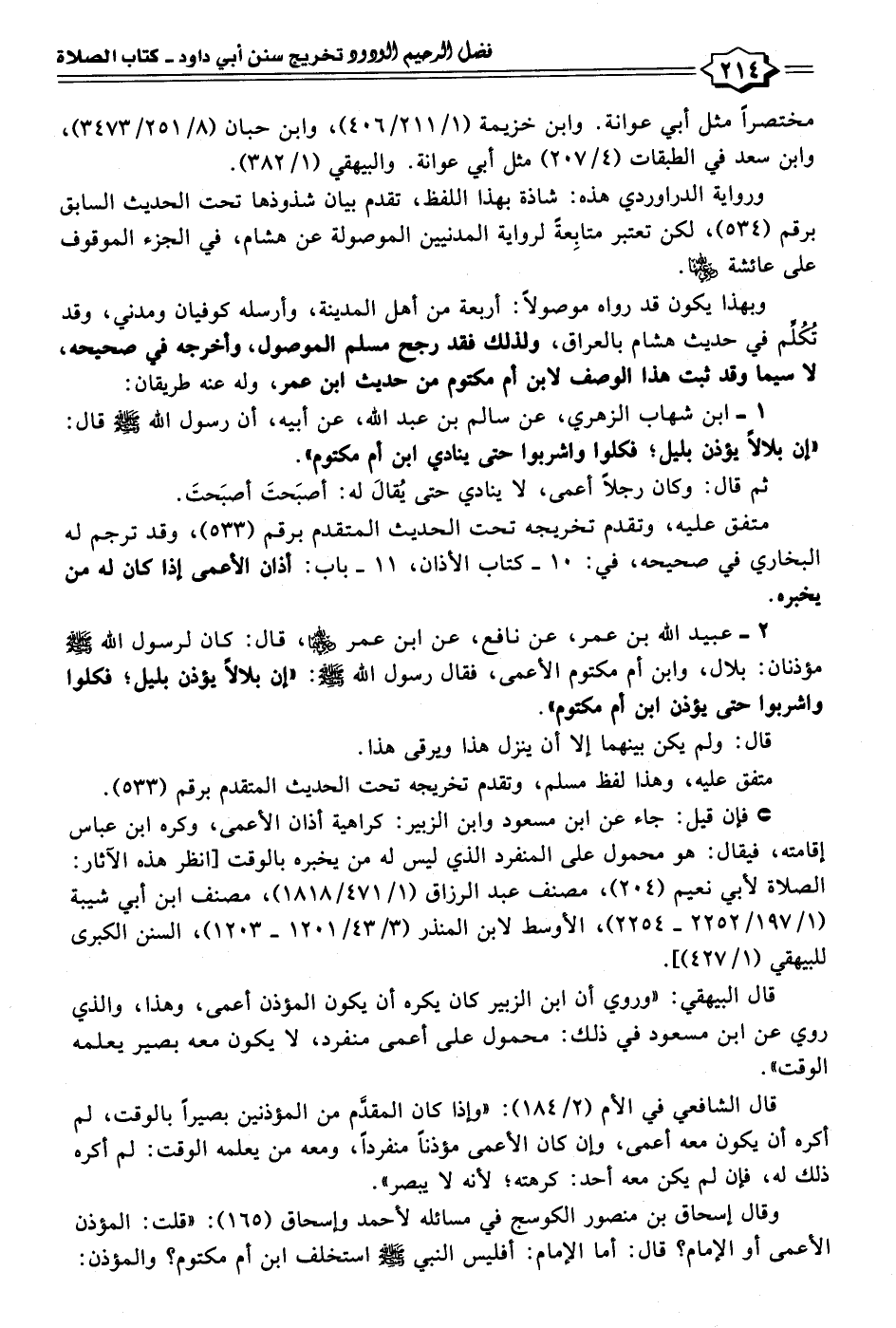 ١ - ابن شهاب الزهري، عن سالم بن عبد الله، عن أبيه، أن رسول الله - صلى الله عليه وسلم - قال: "إن بلالًا يؤذن بليل؛ فكلوا واشربوا حتَّى بنادي ابن أم مكتوم".