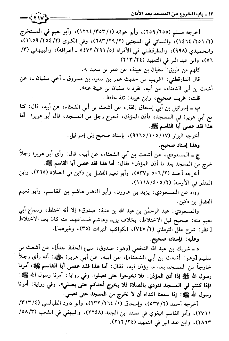 ب - إسرائيل بن أبي إسحاق [ثقة]، عن أشعث بن أبي الشعثاء، عن أبيه، قال: كنا مع أبي هريرة في المسجد، فأذن المؤذن، فخرج رجل من المسجد، قال أبو هريرة: أما هذا فقد عصى أبا القاسم - صلى الله عليه وسلم -.