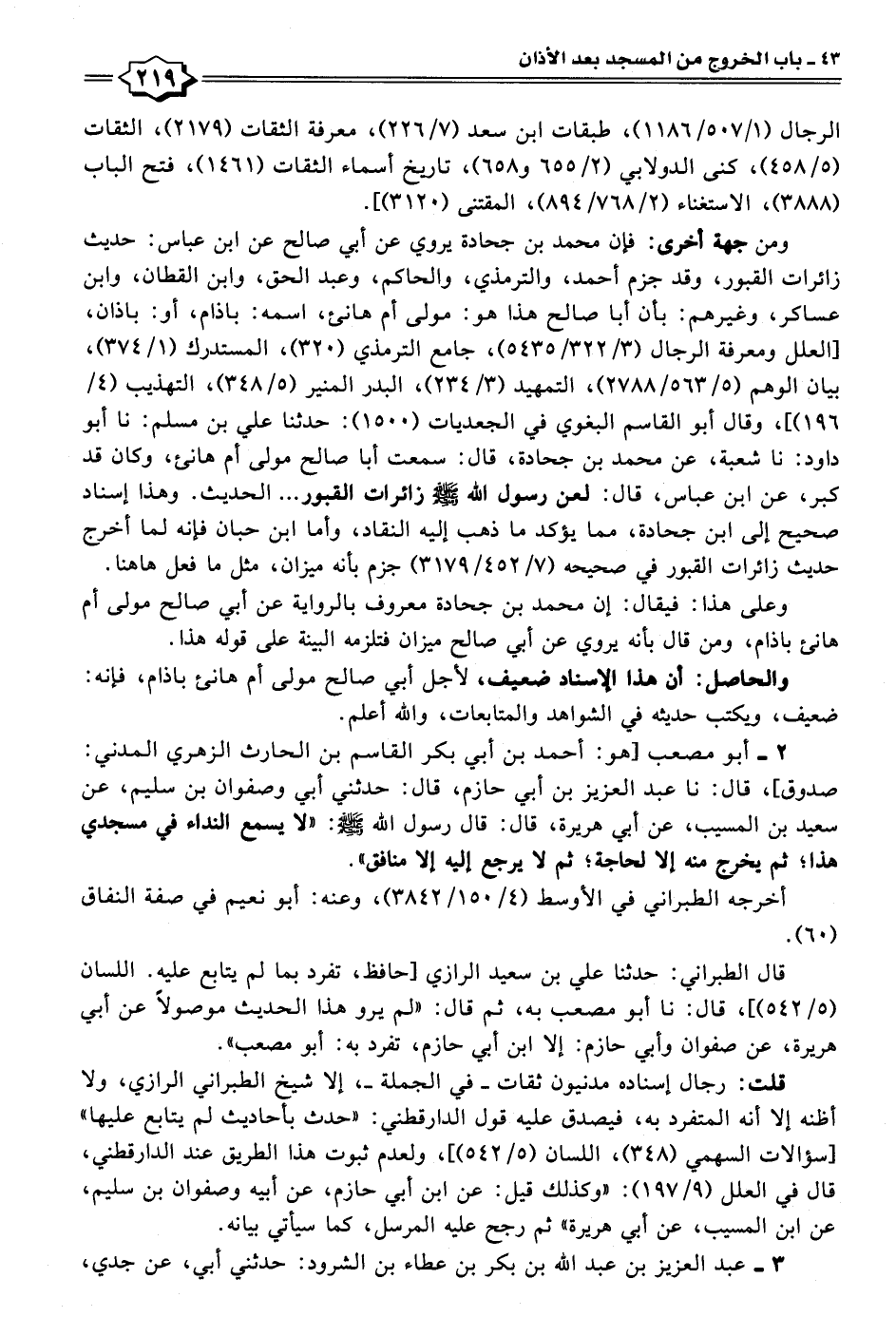 ٢ - أبو مصعب [هو: أحمد بن أبي بكر القاسم بن الحارث الزهري المدني: صدوق]، قال: نا عبد العزيز بن أبي حازم، قال: حدثني أبي وصفوان بن سليم، عن سعيد بن المسيب، عن أبي هريرة، قال: قال رسول الله - صلى الله عليه وسلم -: "لا يسمع النداء في مسجدي هذا؛ ثم يخرج منه إلا لحاجة؛ ثم لا يرجع إليه إلا منافق".