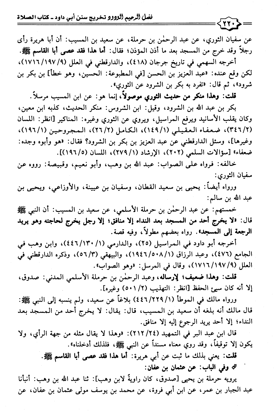 خمستهم: عن عبد الرحمن بن حرملة الأسلمي، عن سعيد بن المسيب: أن النبي - صلى الله عليه وسلم - قال: "لا يخرج أحد من المسجد بعد النداء إلا منافق؛ إلا رجل يخرج لحاجته وهو يريد الرجعة إلى المسجد". رواه بعضهم مطولًا، وفيه قصة.