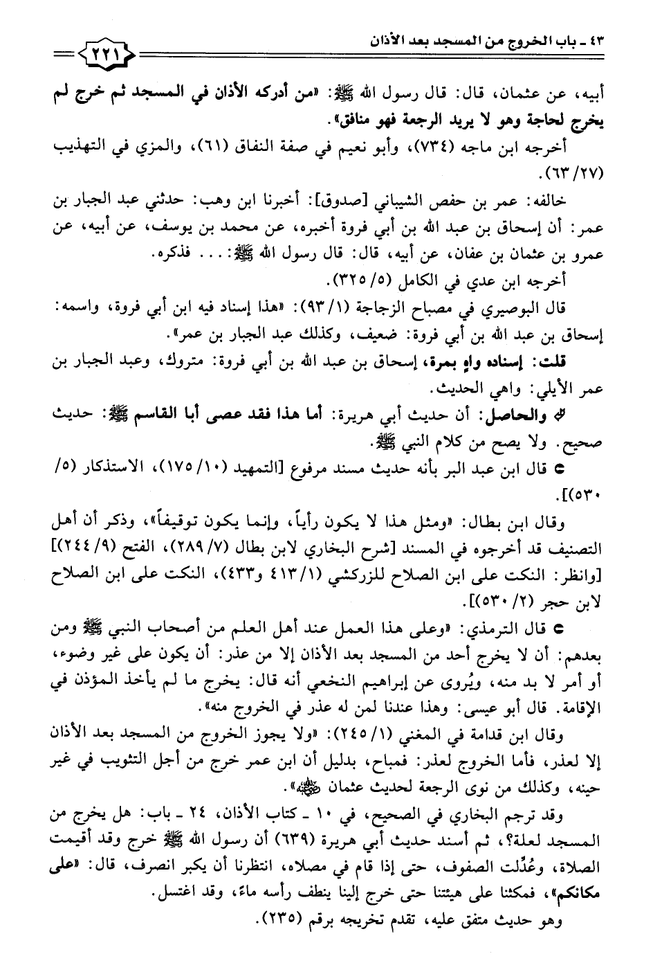 • قال الترمذي: "وعلى هذا العمل عند أهل العلم من أصحاب النبي - صلى الله عليه وسلم - ومن بعدهم: أن لا يخرج أحد من المسجد بعد الأذان إلا من عذر: أن يكون على غير وضوء، أو أمر لا بد منه، ويُروى عن إبراهيم النخعي أنَّه قال: يخرج ما لم يأخذ المؤذن في الإقامة. قال أبو عيسى: وهذا عندنا لمن له عذر في الخروج منه".