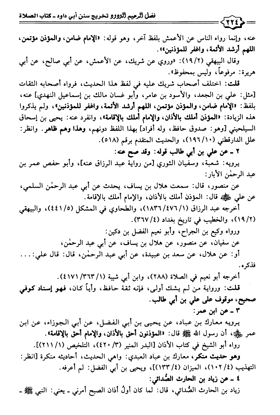 عن منصور، قال: سمعت هلال بن يساف، يحدث عن أبي عبد الرحمن السلمي، عن علي - رضي الله عنه - قال: المؤذن أملك بالأذان، والإمام أملك بالإقامة.