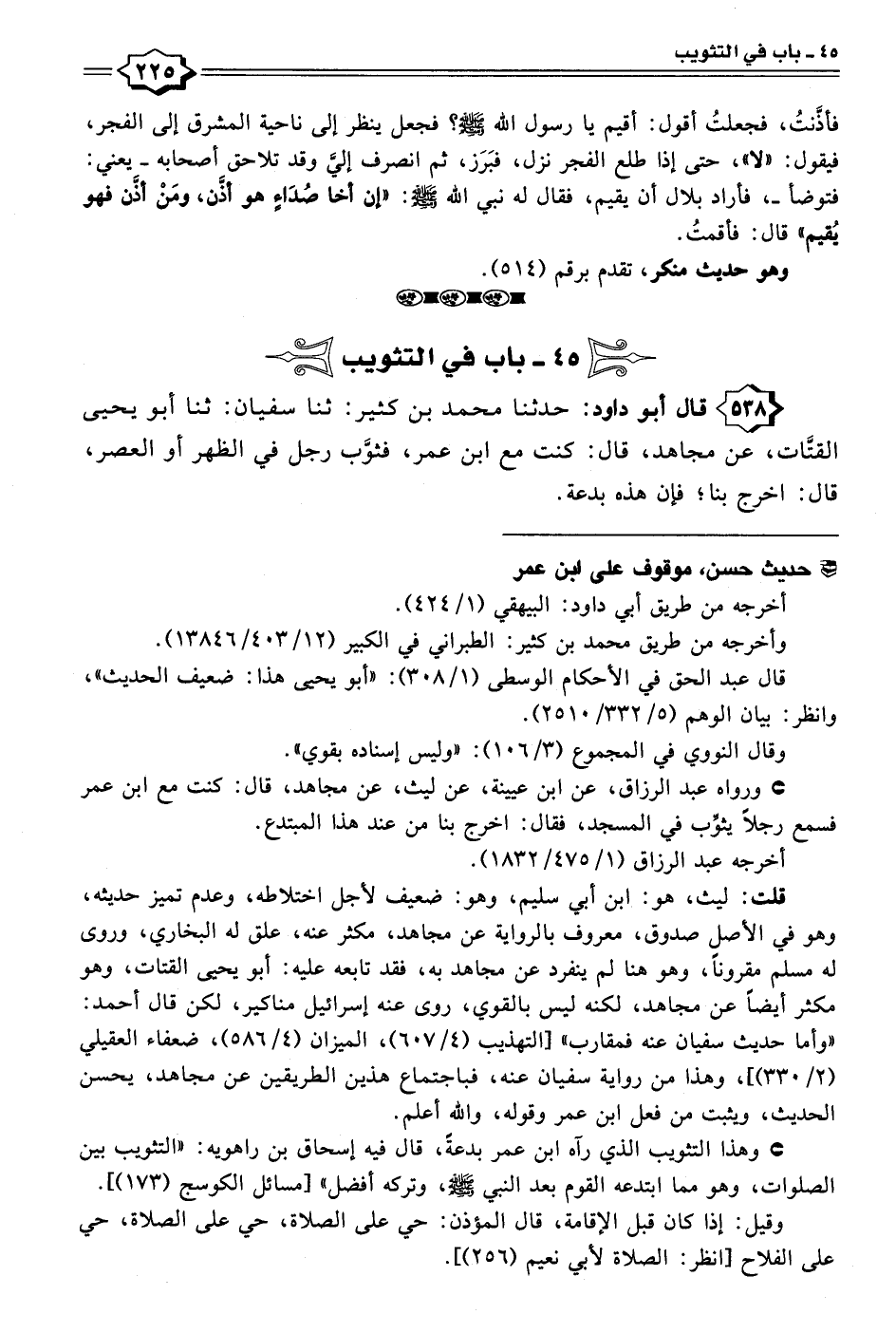 ٥٣٨ - قال أبو داود: حدثنا محمد بن كثير: ثنا سفيان: ثنا أبو يحيى القتَّات، عن مجاهد، قال: كنت مع ابن عمر، فثوَّب رجل في الظهر أو العصر، قال: اخرج بنا؛ فإن هذه بدعة.