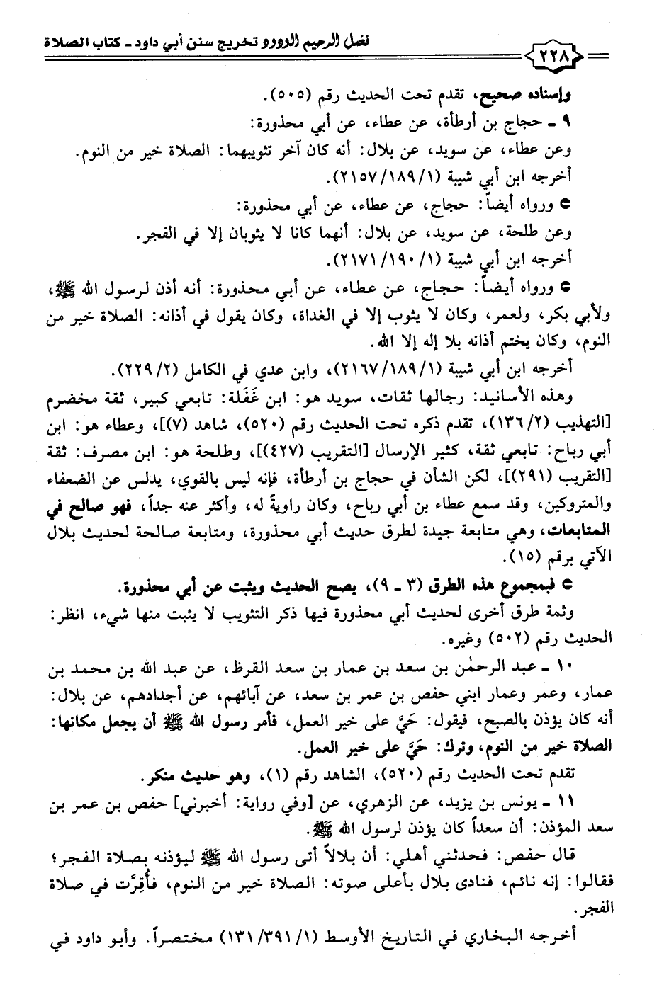 وثمة طرق أخرى لحديث أبي محذورة فيها ذكر التثويب لا يثبت منها شيء، انظر: الحديث رقم (٥٠٢) وغيره.
