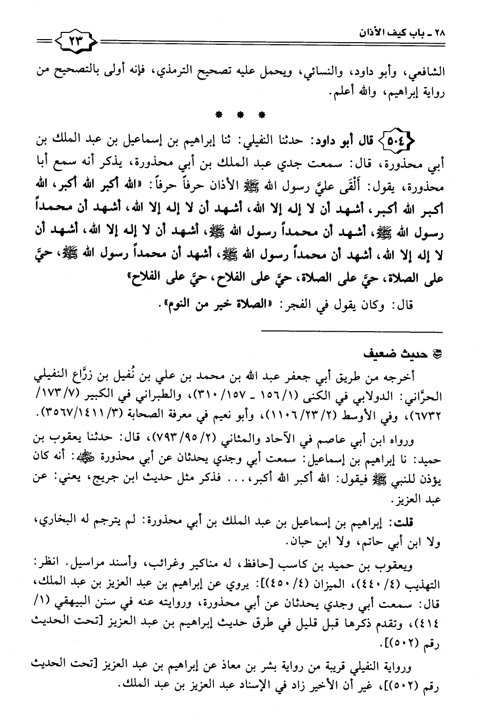 ٥٠٤ - قال أبو داود: حدثنا النفيلي: ثنا إبراهيم بن إسماعيل بن عبد الملك بن أبي محذورة، قال: سمعت جدي عبد الملك بن أبي محذورة، يذكر أنه سمع أبا محذورة، يقول: أَلْقَى عليَّ رسول الله - صلى الله عليه وسلم - الأذان حرفًا حرفًا: "الله أكبر الله أكبر، الله أكبر الله أكبر، أشهد أن لا إله إلا الله، أشهد أن لا إله إلا الله، أشهد أن محمدًا رسول الله - صلى الله عليه وسلم -، أشهد أن محمدًا رسول الله - صلى الله عليه وسلم -، أشهد أن لا إله إلا الله، أشهد أن لا إله إلا الله، أشهد أن محمدًا رسول الله - صلى الله عليه وسلم -، أشهد أن محمدًا رسول الله - صلى الله عليه وسلم -، حيَّ على الصلاة، حيَّ على الصلاة، حيَّ على الفلاح، حيَّ على الفلاح"