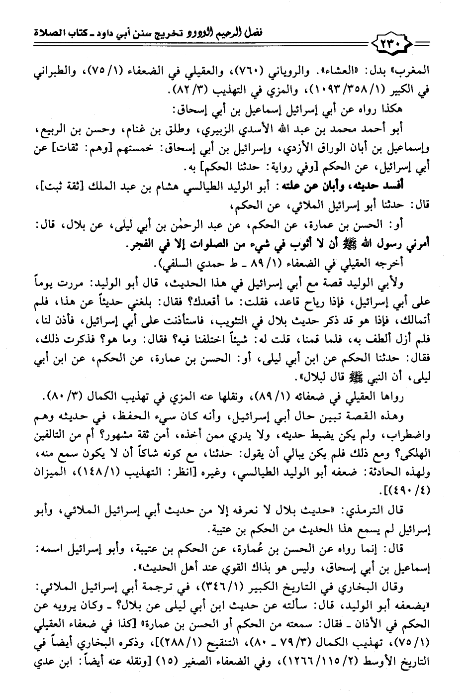 وقال البخاري في التاريخ الكبير (١/ ٣٤٦)، في ترجمة أبي إسرائيل الملائي: "يضعفه أبو الوليد، قال: سألته عن حديث ابن أبي ليلى عن بلال؟ - وكان يرويه عن الحكم في الأذان - فقال: سمعته من الحكم أو الحسن بن عمارة" [كذا في ضعفاء العقيلي (١/ ٧٥)، تهذيب الكمال (٣/ ٧٩ - ٨٠)، التنقيح (١/ ٢٨٨)]، وذكره البخاري أيضًا في التاريخ الأوسط (٢/ ١١٥/ ١٢٦٦)، وفي الضعفاء الصغير (١٥) [ونقله عنه أيضًا: ابن عدي