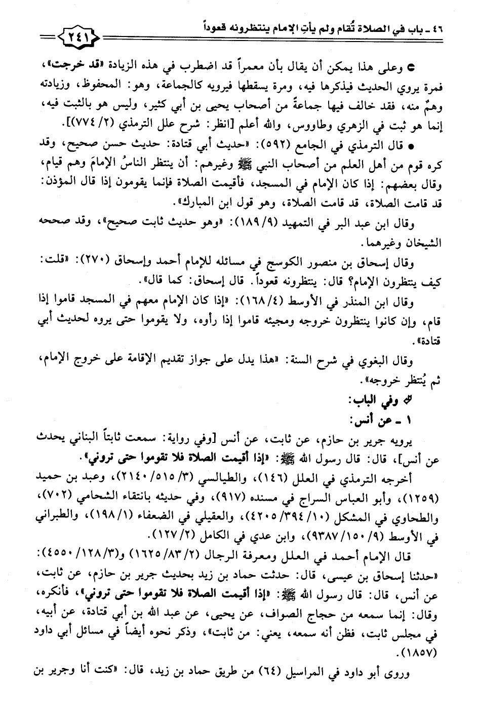 • قال الترمذي في الجامع (٥٩٢): "حديث أبي قتادة: حديث حسن صحيح، وقد كره قوم من أهل العلم من أصحاب النبي - صلى الله عليه وسلم - وغيرهم: أن ينتظر الناسُ الإمامَ وهم قيام، وقال بعضهم: إذا كان الإمام في المسجد، فأُقيمت الصلاة فإنما يقومون إذا قال المؤذن: قد قامت الصلاة، قد قامت الصلاة، وهو قول ابن المبارك".