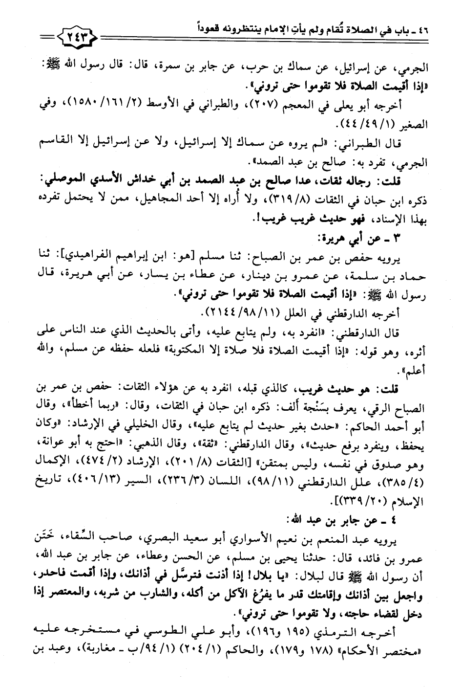 يرويه حفص بن عمر بن الصباح: ثنا مسلم [هو: ابن إبراهيم الفراهيدي]: ثنا حماد بن سلمة، عن عمرو بن دينار، عن عطاء بن يسار، عن أبي هريرة، قال رسول الله - صلى الله عليه وسلم -: "إذا أقيمت الصلاة فلا تقوموا حتَّى تروني".
