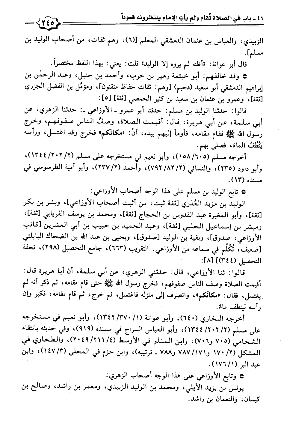 قالوا: حدثنا الوليد بن مسلم: حدثنا أبو عمرو - الأوزاعي -: حدثنا الزهري، عن أبي سلمة، عن أبي هريرة، قال: أقيمت الصلاة، وصفَّ الناس صفوفهم، وخرج رسول الله - صلى الله عليه وسلم - فقام مقامه، فأوما إليهم بيده، أنْ: "مكانَكم" فخرج وقد اغتسل، ورأسه يَنْطُفُ الماءَ، فصلى بهم.