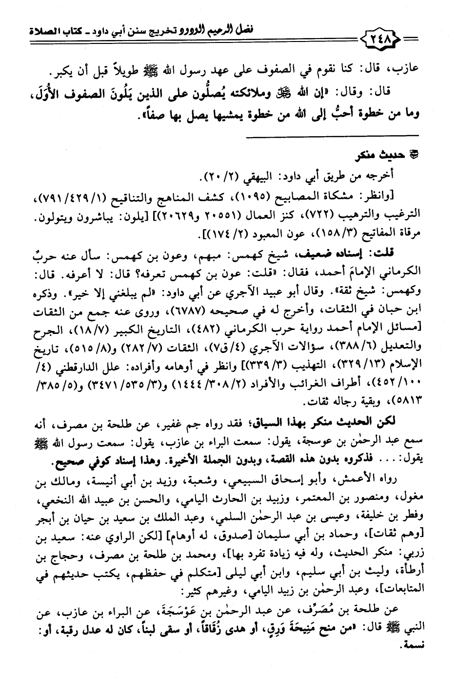 لكن الحديث منكر بهذا السياق؛ فقد رواه جم غفير، عن طلحة بن مصرف، أنَّه سمع عبد الرحمن بن عوسجة، يقول: سمعت البراء بن عازب، يقول: سمعت رسول الله - صلى الله عليه وسلم - يقول: ... فذكروه بدون هذه القصة، وبدون الجملة الأخيرة. وهذا إسناد كوفي صحيح.