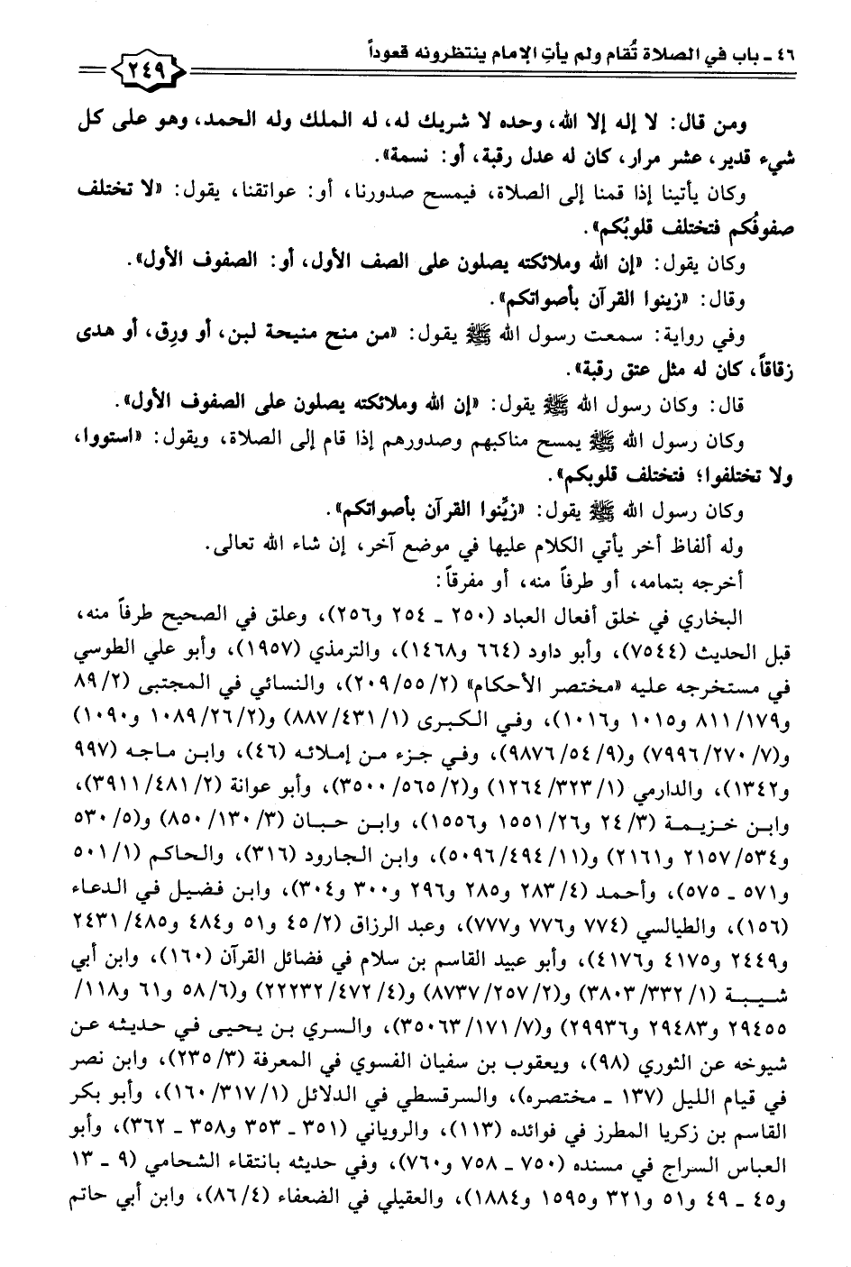 وكان يأتينا إذا قمنا إلى الصلاة، فيمسح صدورنا، أو: عواتقنا، يقول: "لا تختلف صفوفكم فتختلف قلوبُكم".