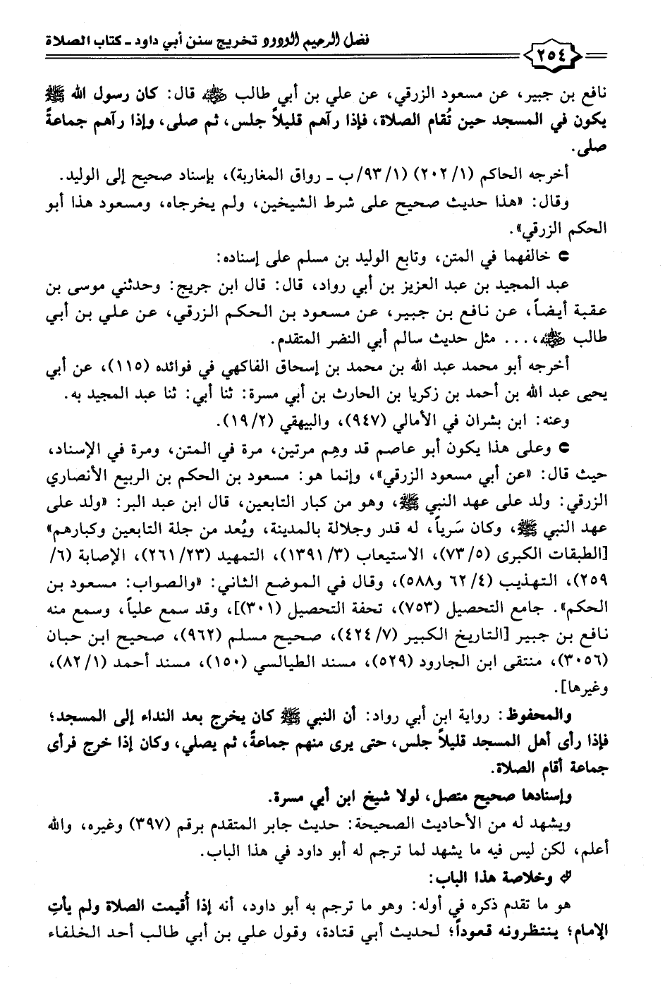 نافع بن جبير، عن مسعود الزرقي، عن علي بن أبي طالب - رضي الله عنه - قال: كان رسول الله - صلى الله عليه وسلم - يكون في المسجد حين تُقام الصلاة، فإذا رآهم قليلًا جلس، ثم صلى، وإذا رآهم جماعةً صلى.
