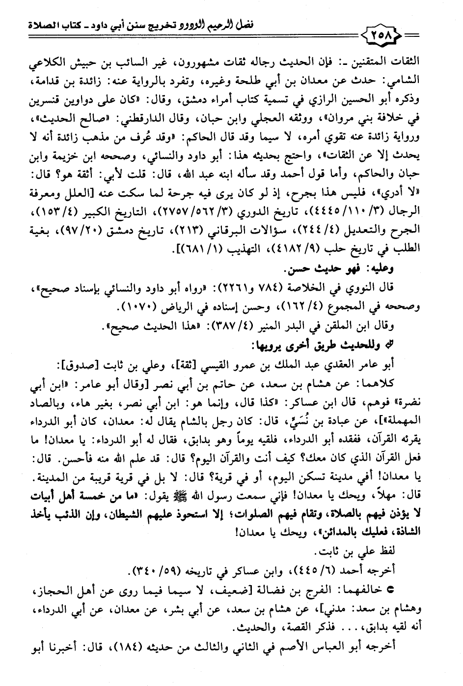 الثقات المتقنين -: فإن الحديث رجاله ثقات مشهورون، غير السائب بن حبيش الكلاعي الشامي: حدث عن معدان بن أبي طلحة وغيره، وتفرد بالرواية عنه: زائدة بن قدامة، وذكره أبو الحسين الرازي في تسمية كتاب أمراء دمشق، وقال: "كان على دواوين قنسرين في خلافة بني مروان"، ووثقه العجلي وابن حبان، وقال الدارقطني: "صالح الحديث"، ورواية زائدة عنه تقوي أمره، لا سيما وقد قال الحاكم: "وقد عُرف من مذهب زائدة أنَّه لا يحدث إلا عن الثقات"، واحتج بحديثه هذا: أبو داود والنسائي، وصححه ابن خزيمة وابن حبان والحاكم، وأما قول أحمد وقد سأله ابنه عبد الله، قال: قلت لأبي: أثقة هو؟ قال: "لا أدري" فليس هذا بجرح، إذ لو كان يرى فيه جرحة لما سكت عنه [العلل ومعرفة الرجال (٣/ ١١٠/ ٤٤٤٥)، تاريخ الدوري (٣/ ٥٦٢/ ٢٧٥٧)، التاريخ الكبير (٤/ ١٥٣)، الجرح والتعديل (٤/ ٢٤٤)، سؤالات البرقاني (٢١٣)، تاريخ دمشق (٢٠/ ٩٧)، بغية الطلب في تاريخ حلب (٩/ ٤١٨٢)، التهذيب (١/ ٦٨١)].