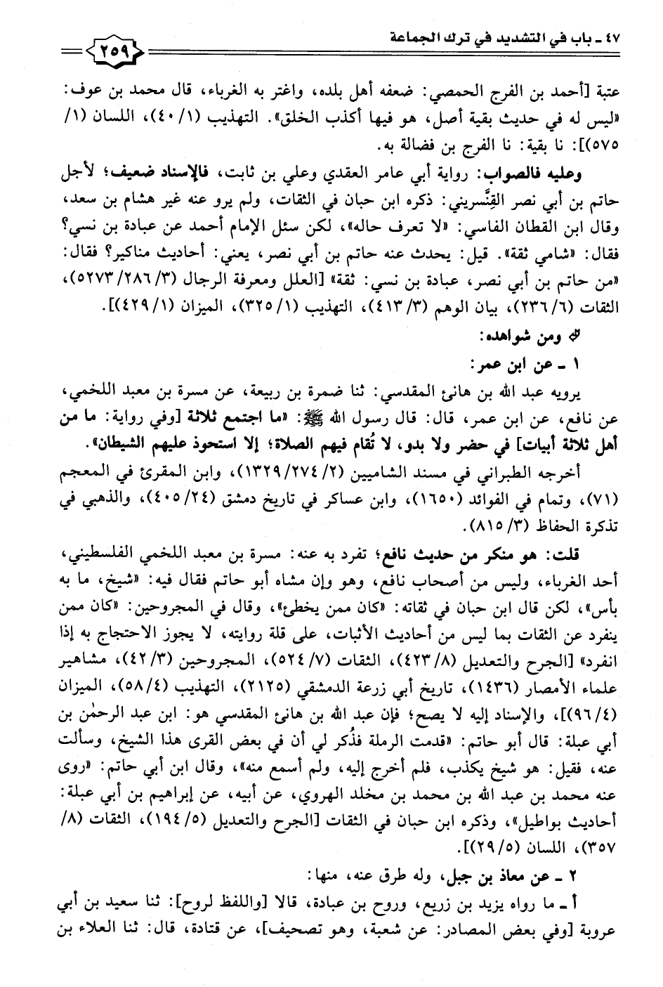 يرويه عبد الله بن هانئ المقدسي: ثنا ضمرة بن ربيعة، عن مسرة بن معبد اللخمي، عن نافع، عن ابن عمر، قال: قال رسول الله - صلى الله عليه وسلم -: "ما اجتمع ثلاثة [وفي رواية: ما من أهل ثلاثة أبيات] في حضر ولا بدو، لا تُقام فيهم الصلاة إلا استحوذ عليهم الشيطان".