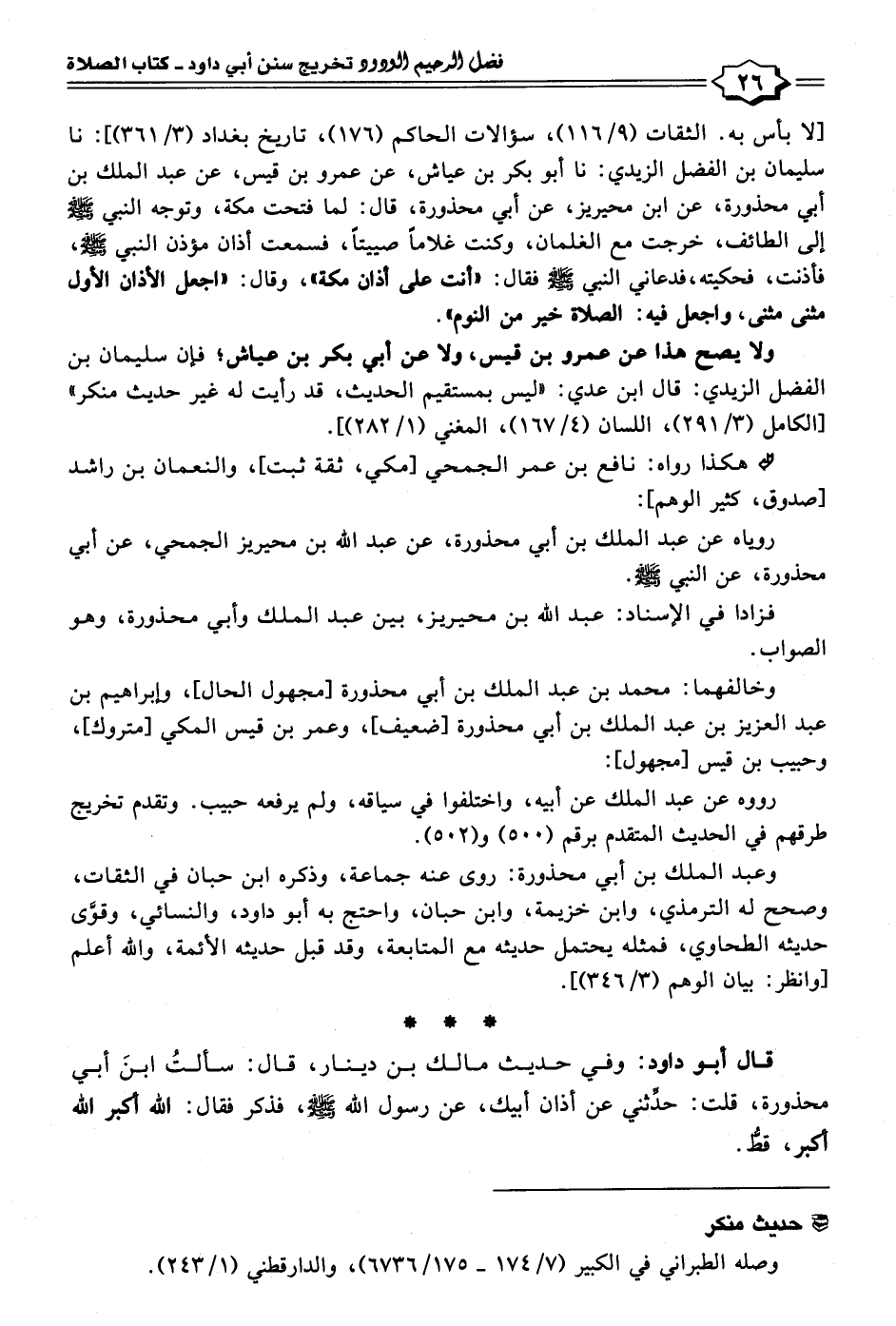 [لا بأس به. الثقات (٩/ ١١٦)، سؤالات الحاكم (١٧٦)، تاريخ بغداد (٣/ ٣٦١)]: نا سليمان بن الفضل الزيدي: نا أبو بكر بن عياش، عن عمرو بن قيس، عن عبد الملك بن أبي محذورة، عن ابن محيريز، عن أبي محذورة، قال: لما فتحت مكة، وتوجه النبي - صلى الله عليه وسلم - إلى الطائف، خرجت مع الغلمان، وكنت غلامًا صييتًا، فسمعت أذان مؤذن النبي - صلى الله عليه وسلم -، فأذنت، فحكيته، فدعاني النبي - صلى الله عليه وسلم - فقال: "أنت على أذان مكة"، وقال: "اجعل الأذان الأول مثنى مثنى، واجعل فيه: الصلاة خير من النوم".