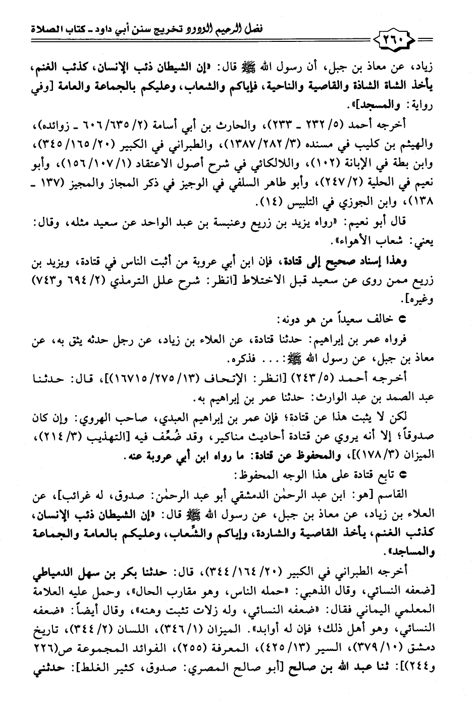 القاسم [هو: ابن عبد الرحمن الدمشقي أبو عبد الرحمن: صدوق، له غرائب]، عن العلاء بن زياد، عن معاذ بن جبل، عن رسول الله - صلى الله عليه وسلم - قال: "إن الشيطان ذئب الإنسان، كذئب الغنم، يأخذ القاصية والشاردة، وإياكم والشِّعاب، وعليكم بالعامة والجماعة والمساجد".