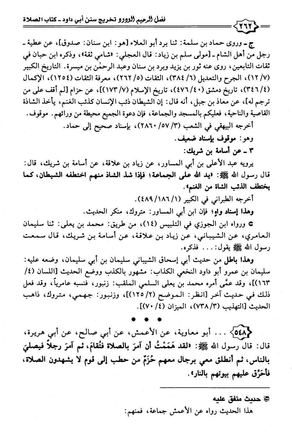 ٥٤٨ - . . . أبو معاوية، عن الأعمش، عن أبي صالح، عن أبي هريرة، قال: قال رسول الله - صلى الله عليه وسلم -: "لقد هَمَمْتُ أن آمرَ بالصلاة فتُقامَ، ثم آمرَ رجلًا فيصليَ بالناس، ثم أنطلق معي برجال معهم حُزَمٌ من حطب إلى قوم لا يشهدون الصلاة، فأُحَرِّق عليهم بيوتهم بالنار".