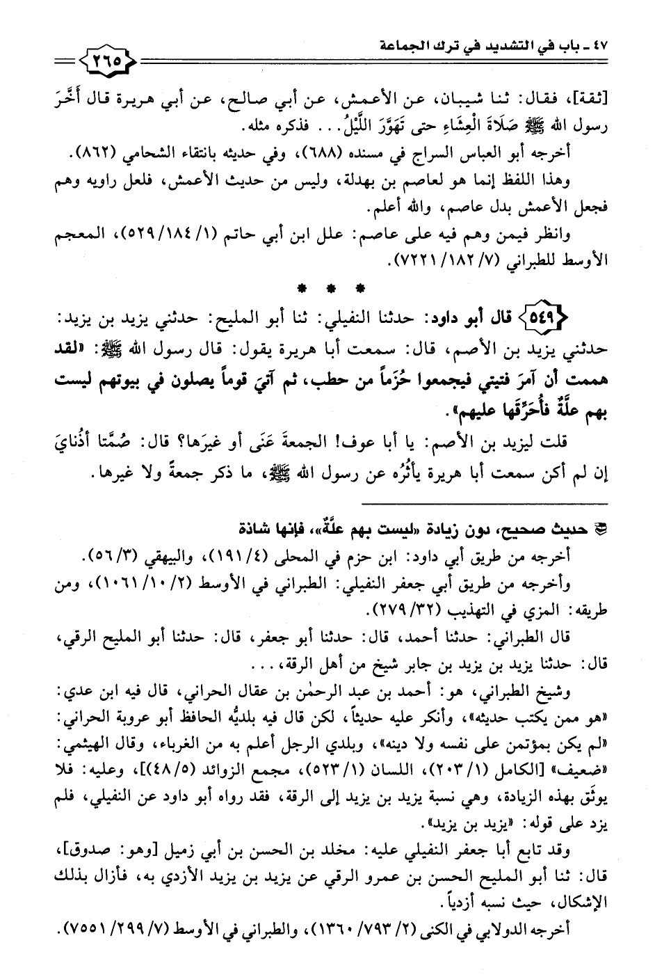 ٥٤٩ - قال أبو داود: حدثنا النفيلي: ثنا أبو المليح: حدثني يزيد بن يزيد: حدثني يزيد بن الأصم، قال: سمعت أبا هريرة يقول: قال رسول الله - صلى الله عليه وسلم -: "لقد هممت أن آمرَ فتيتي فيجمعوا حُزَمًا من حطب، ثم آتيَ قومًا يصلون في بيوتهم ليست بهم علَّةٌ فأُحَرِّقَها عليهم".