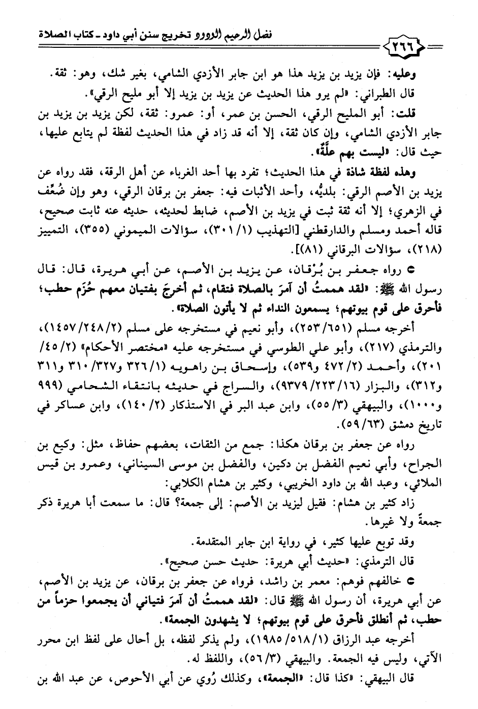 • رواه جعفر بن بُرْقان، عن يزيد بن الأصم، عن أبي هريرة، قال: قال رسول الله - صلى الله عليه وسلم -: "لقد هممتُ أن آمُرَ بالصلاة فتقام، ثم أخرجَ بفتيان معهم حُزَم حطب؛ فأحرق على قوم بيوتهم؛ يسمعون النداء ثم لا يأتون الصلاة".