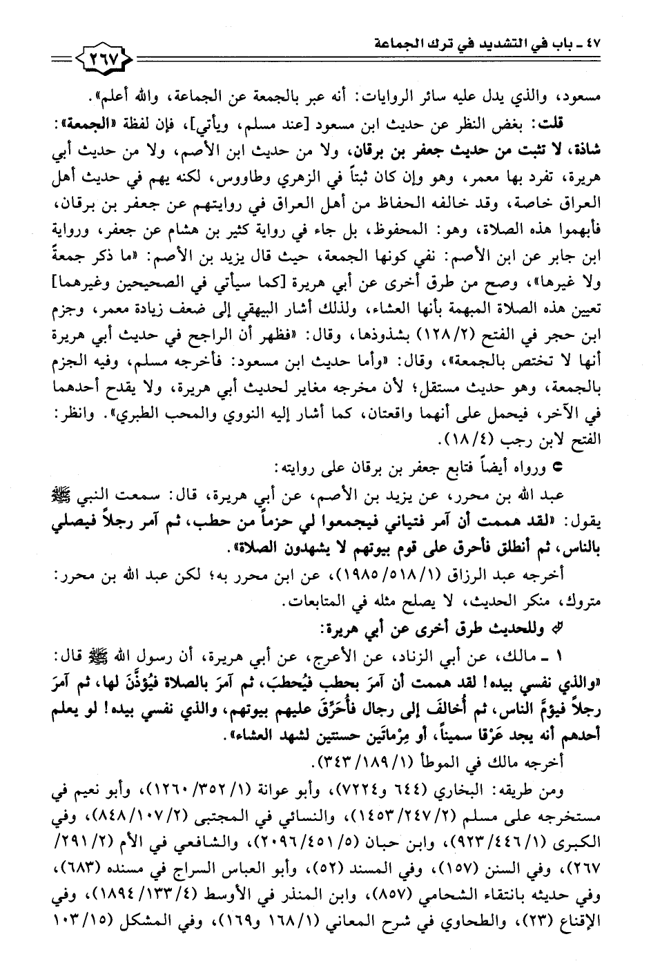 ١ - مالك، عن أبي الزناد، عن الأعرج، عن أبي هريرة، أن رسول الله - صلى الله عليه وسلم - قال: "والذي نفسي بيده! لقد هممت أن آمرَ بحطب فيُحطبَ، ثم آمرَ بالصلاة فيُؤذَّنَ لها، ثم آمرَ رجلًا فيؤمَّ الناس، ثم أُخالفَ إلى رجال فأُحَرِّقَ عليهم بيوتهم، والذي نفسي بيده! لو يعلم أحدهم أنَّه يجد عَرْقا سمينًا، أو مِرْماتَين حسنتين لشهد العشاء".