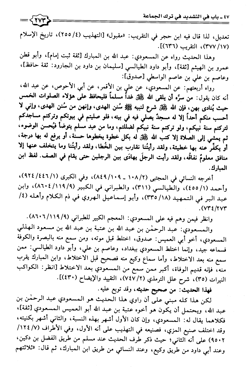 رواه أربعتهم: عن المسعودي، عن علي بن الأقمر، عن أبي الأحوص، عن عبد الله، أنه كان يقول: من سرَّه أن يلقى الله عَزَّ وَجَلَّ غدًا مسلمًا فليحافظ على هؤلاء الصلوات الخمس حيث يُنادى بهن، فإن الله عَزَّ وَجَلَّ شرع لنبيه - صلى الله عليه وسلم - سُنن الهدى، وإنهن من سُنن الهدى، وإني لا أحسب منكم أحدًا إلا له مسجدٌ يصلي فيه في بيته، فلو صليتم في بيوتكم وتركتم مساجدكم لتركتم سنة نبيكم، ولو تركتم سنة نبيكم لضللتم، وما من عبد مسلم يتوضأ فيُحسن الوضوء، ثم يمشي إلى الصلاة إلا كتب الله عَزَّ وَجَلَّ له بكل خطوة يخطوها حسنة، أو يرفع له بها درجة، أو يكفِّر عنه بها خطيئة، ولقد رأيتُنا نقارب بين الخُطا، ولقد رأيتُنا وما يتخلف عنها إلا منافق معلومٌ نفاقُه، ولقد رأيت الرجلَ يهادَى بين الرجلين حتى يقام في الصف. لفظ ابن المبارك.