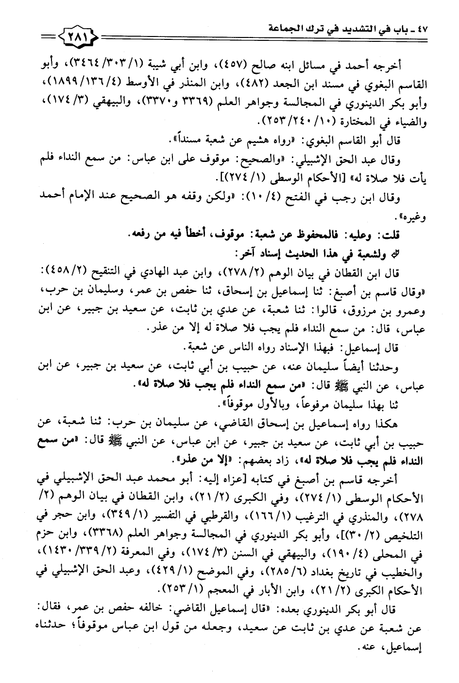 قال ابن القطان في بيان الوهم (٢/ ٢٧٨)، وابن عبد الهادي في التنقيح (٢/ ٤٥٨): "وقال قاسم بن أصبغ: ثنا إسماعيل بن إسحاق، ثنا حفص بن عمر، وسليمان بن حرب، وعمرو بن مرزوق، قالوا: ثنا شعبة، عن عدي بن ثابت، عن سعيد بن جبير، عن ابن عباس، قال: من سمع النداء فلم يجب فلا صلاة له إلا من عذر.