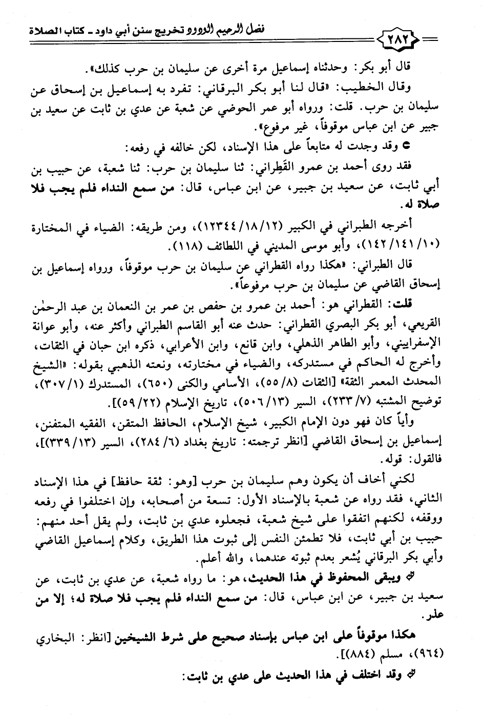 لكني أخاف أن يكون وهم سليمان بن حرب [وهو: ثقة حافظ، في هذا الإسناد الثاني، فقد رواه عن شعبة بالإسناد الأول: تسعة من أصحابه، وإن اختلفوا في رفعه ووقفه، لكنهم اتفقوا على شيخ شعبة، فجعلوه عدي بن ثابت، ولم يقل أحد منهم: حبيب بن أبي ثابت، فلا تطمئن النفس إلى ثبوت هذا الطريق، وكلام إسماعيل القاضي وأبي بكر البرقاني يُشعر بعدم ثبوته عندهما، والله أعلم.