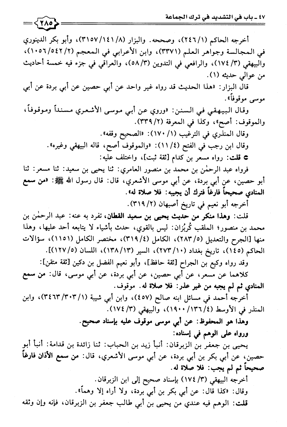 يحيى بن جعفر بن الزبرقان: أنبأ زيد بن الحباب: ثنا زائدة بن قدامة: أنبأ أبو حصين، عن أبي بكر بن أبي بردة، عن أبي موسى الأشعري، قال: من سمع الأذان فارغًا صحيحًا ثم لم يجب: فلا صلاة له.