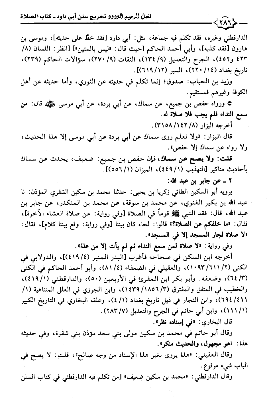 يرويه أبو السكين الطائي زكريا بن يحيى: حدثنا محمد بن سكين الشقري المؤذن: نا عبد الله بن بكير الغنوي، عن محمد بن سوقة، عن محمد بن المنكدر، عن جابر بن عبد الله، قال: فقد النبي - صلى الله عليه وسلم - قومًا في الصلاة [وفي رواية: عن صلاة العشاء الآخرة]، فقال: "ما خلفكم عن الصلاة؟ " قالوا: لحاء كان بيننا [وفي رواية: وقع بيننا كلام]، فقال: إلا صلاة لجار المسجد إلا في المسجد".
