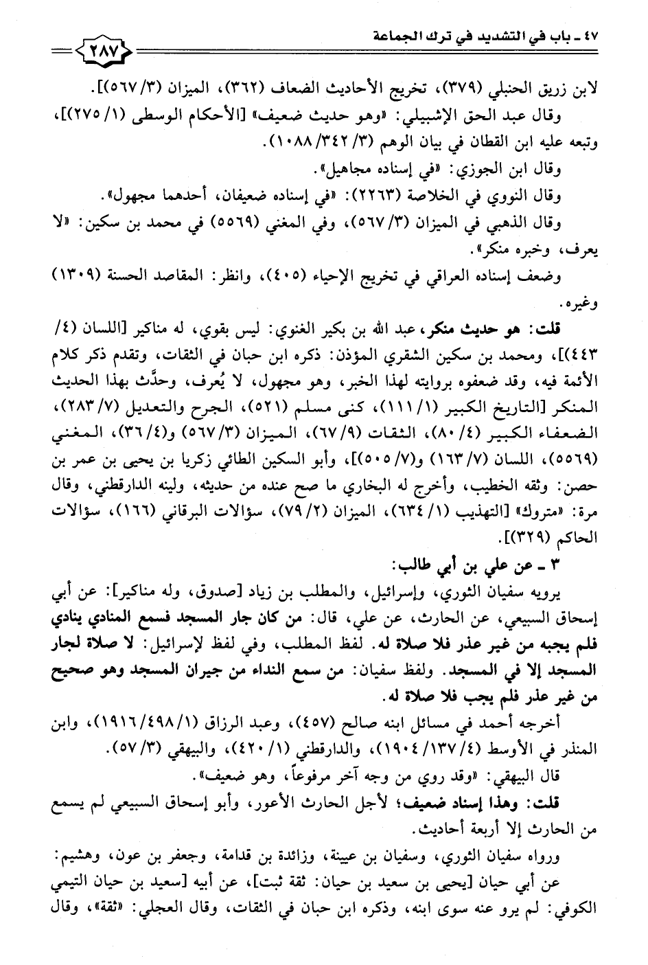 يرويه سفيان الثوري، وإسرائيل، والمطلب بن زياد [صدوق، وله مناكير]: عن أبي إسحاق السبيعي، عن الحارث، عن علي، قال: من كان جار المسجد فسمع المنادي ينادي فلم يجبه من غير عذر فلا صلاة له. لفظ المطلب، وفي لفظ لإسرائيل: لا صلاة لجار المسجد إلا في المسجد. ولفظ سفيان: من سمع النداء من جيران المسجد وهو صحيح من غير عذر فلم يجب فلا صلاة له.