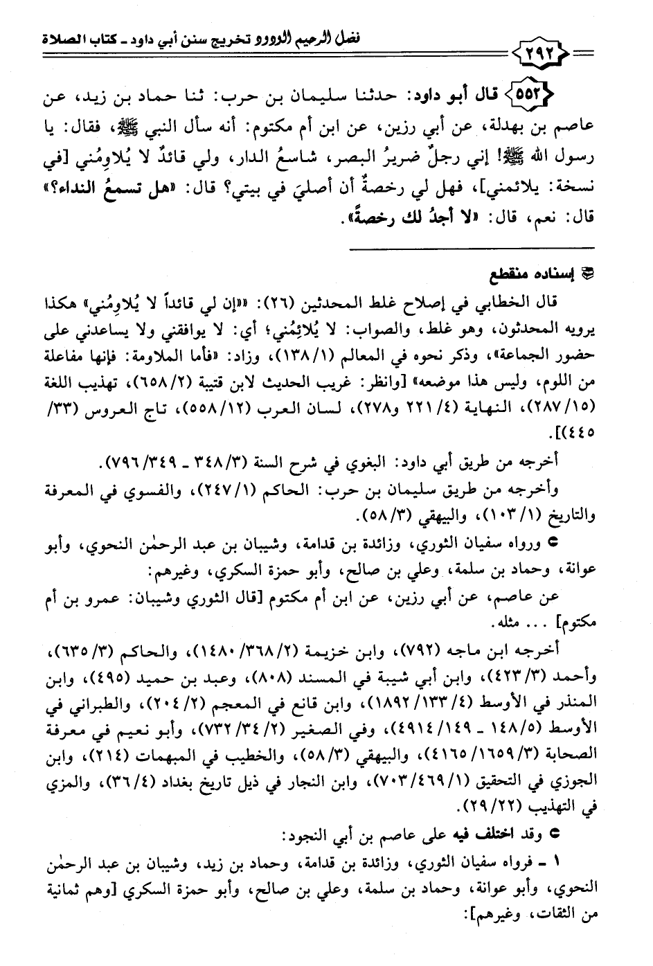 ٥٥٢ - قال أبو داود: حدثنا سليمان بن حرب: ثنا حماد بن زيد، عن عاصم بن بهدلة، عن أبي رزين، عن ابن أم مكتوم: أنه سأل النبي - صلى الله عليه وسلم -، فقال: يا رسول الله - صلى الله عليه وسلم -! إني رجلٌ ضريرُ البصر، شاسعُ الدار، ولي قائدٌ لا يُلاوِمُني [في نسخة: يلائمني]، فهل لي رخصةٌ أن أصليَ في بيتي؟ قال: "هل تسمعُ النداء؟ " قال: نعم، قال: "لا أجدُ لك رخصةً".
