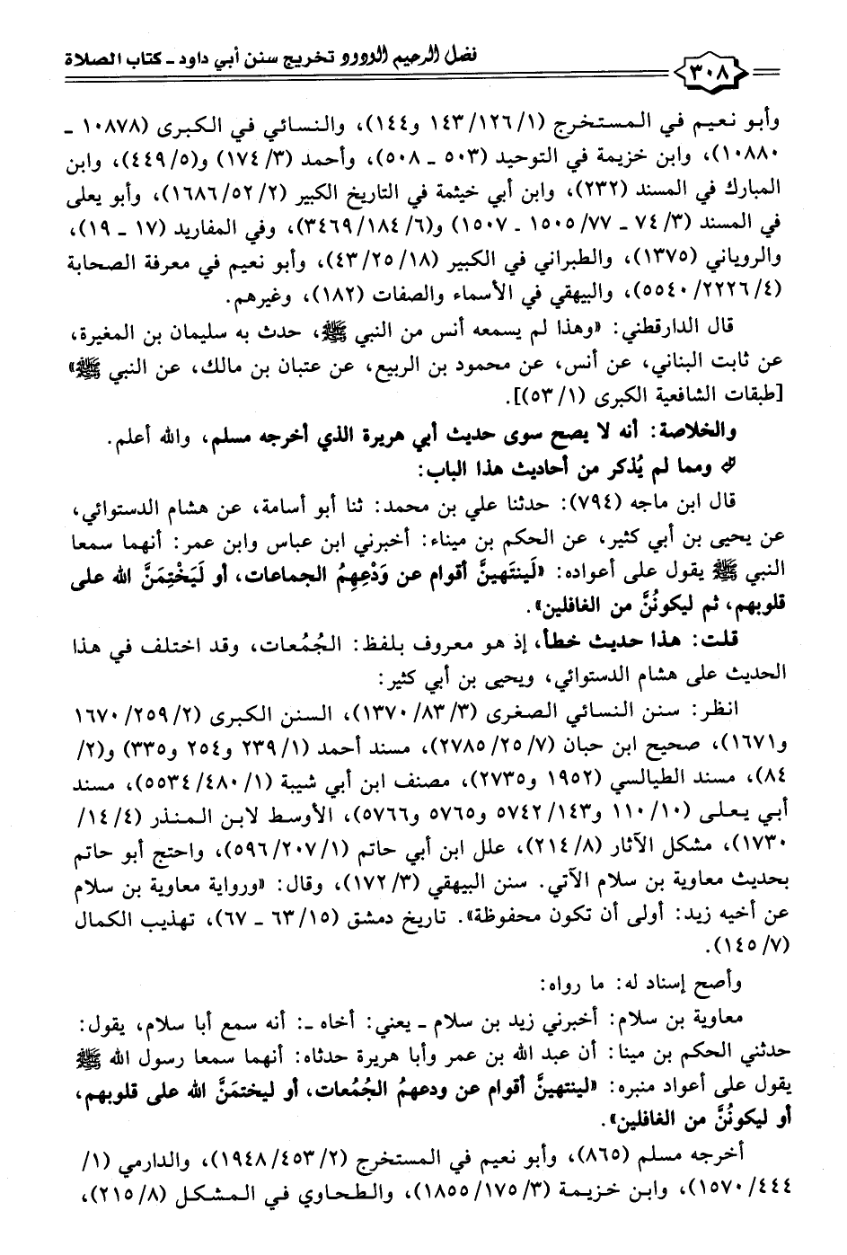 قال ابن ماجه (٧٩٤): حدثنا علي بن محمد: ثنا أبو أسامة، عن هشام الدستوائي، عن يحيى بن أبي كثير، عن الحكم بن ميناء: أخبرني ابن عباس وابن عمر: أنهما سمعا النبي - صلى الله عليه وسلم - يقول على أعواده: "لَينتَهينَّ أقوامٌ عن وَدْعِهِمُ الجماعات، أو لَيَخْتِمَنَّ الله على قلوبهم، ثم ليكونُنَّ من الغافلين".
