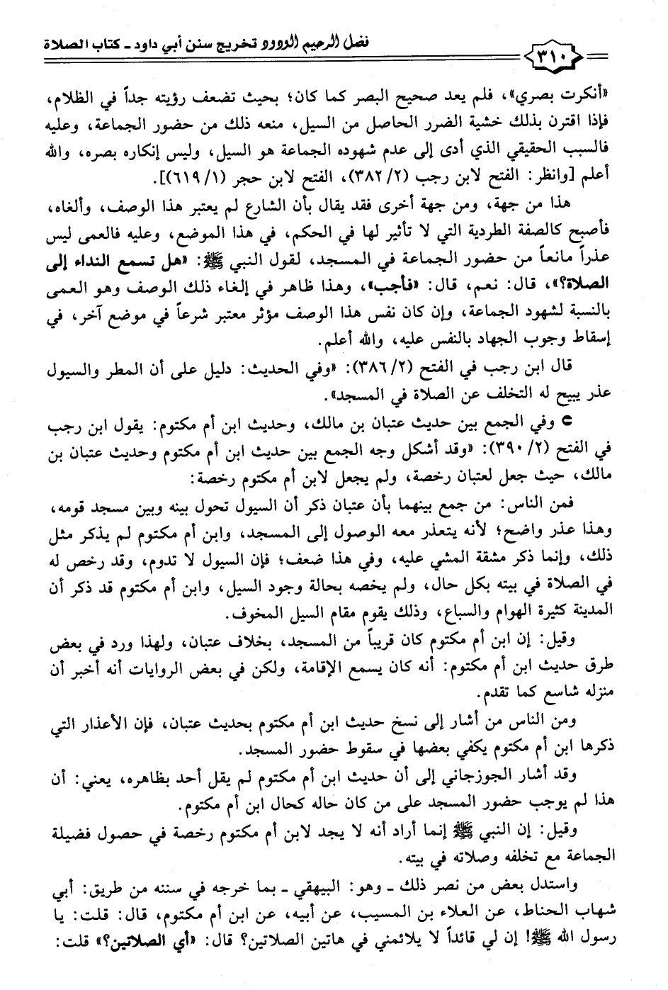 • وفي الجمع بين حديث عتبان بن مالك، وحديث ابن أم مكتوم: يقول ابن رجب في الفتح (٢/ ٣٩٠): "وقد أشكل وجه الجمع بين حديث ابن أم مكتوم وحديث عتبان بن مالك، حيث جعل لعتبان رخصة، ولم يجعل لابن أم مكتوم رخصة: