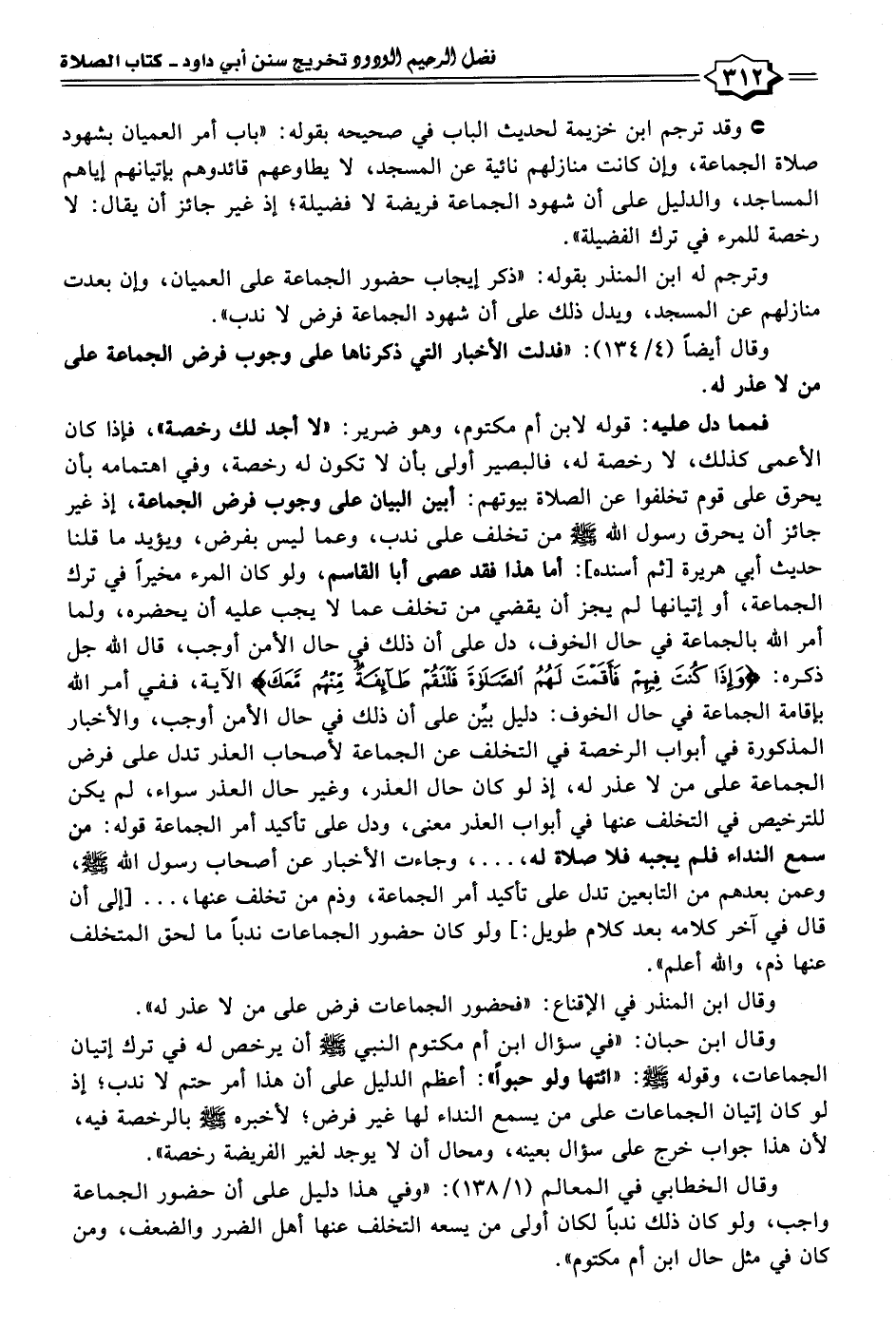 وترجم له ابن المنذر بقوله: "ذكر إيجاب حضور الجماعة على العميان، وإن بعدت منازلهم عن المسجد، ويدل ذلك على أن شهود الجماعة فرض لا ندب".