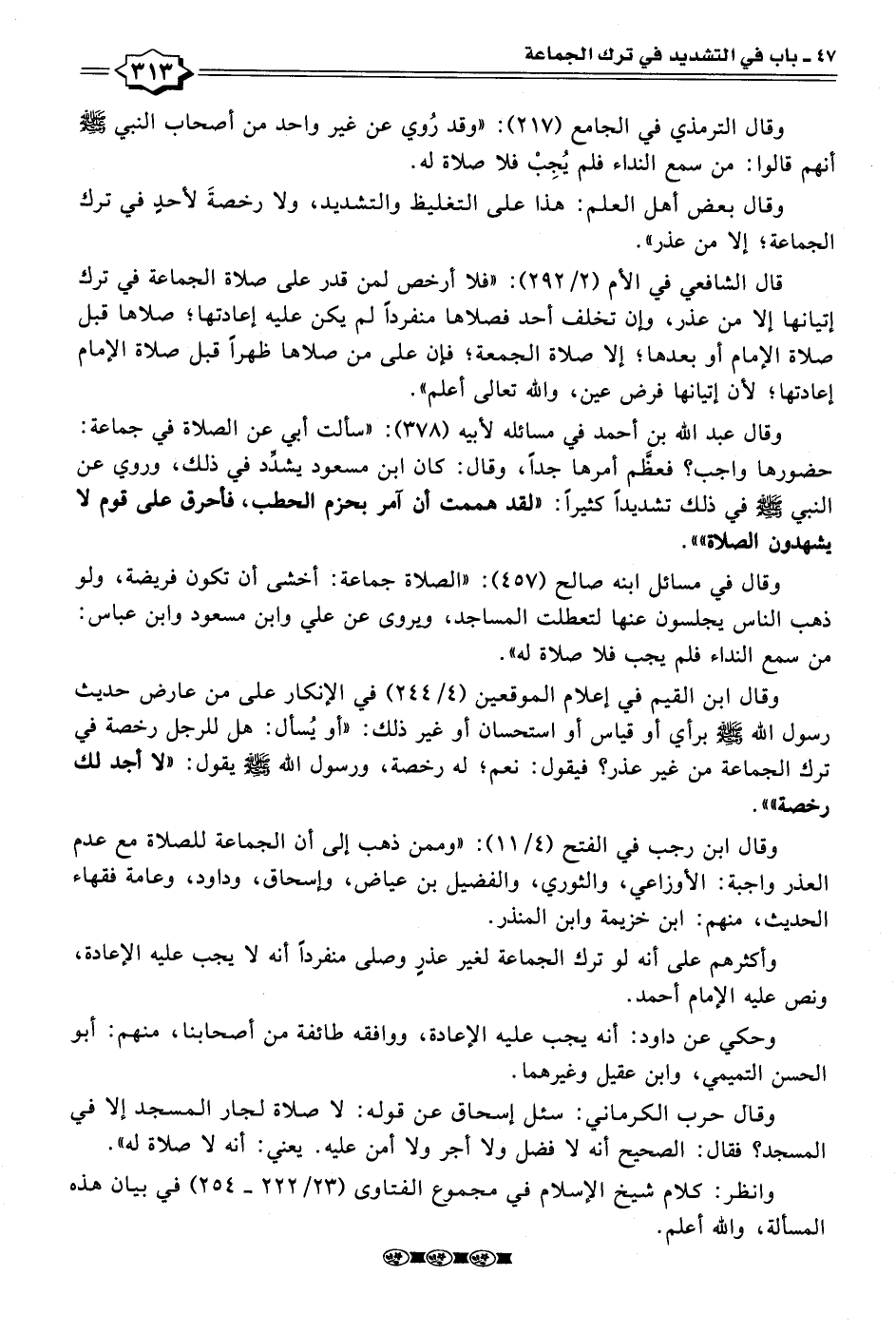 وقال عبد الله بن أحمد في مسائله لأبيه (٣٧٨): "سألت أبي عن الصلاة في جماعة: حضورها واجب؟ فعظَّم أمرها جدًّا، وقال: كان ابن مسعود يشدِّد في ذلك، وروي عن النبي - صلى الله عليه وسلم - في ذلك تشديدًا كثيرًا: "لقد هممت أن آمر بحزم الحطب، فأحرق على قوم لا يشهدون الصلاة"".